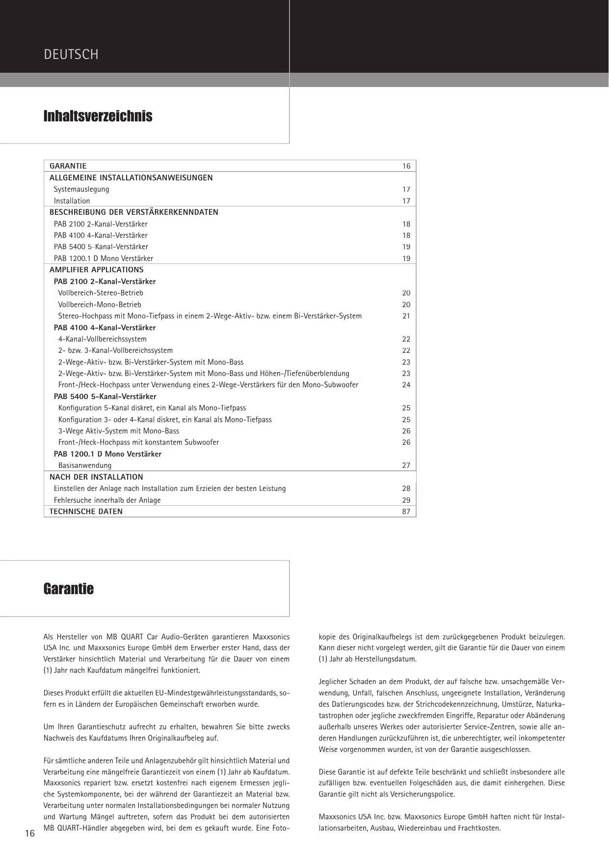 Als Hersteller von MB QUART Car Audio-Geräten garantieren Maxxsonics USA Inc. und Maxxsonics Europe GmbH dem Erwerber erster Hand, dass der Verträger hinsichtlich Material und Verarbeitung für die Dauer von einem (1) Jahr nach Kaufdatum mängelfrei Funktioniert.