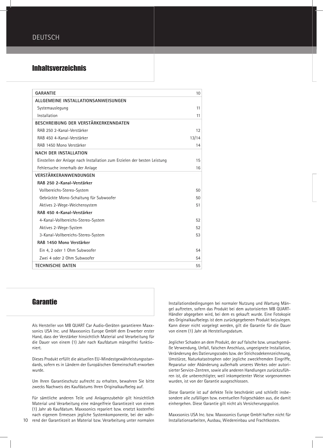 Als Hersteller von MB QUART Car Audio-Geräten garantieren Maxxsonics USA Inc. und Maxxsonics Europe GmbH dem Erwerber erster Hand, dass der Verträker hinsichtlich Material und Verarbeitung für die Dauer von einem (1) Jahr nach Kaufdatum mängelfrei Funktioniert.