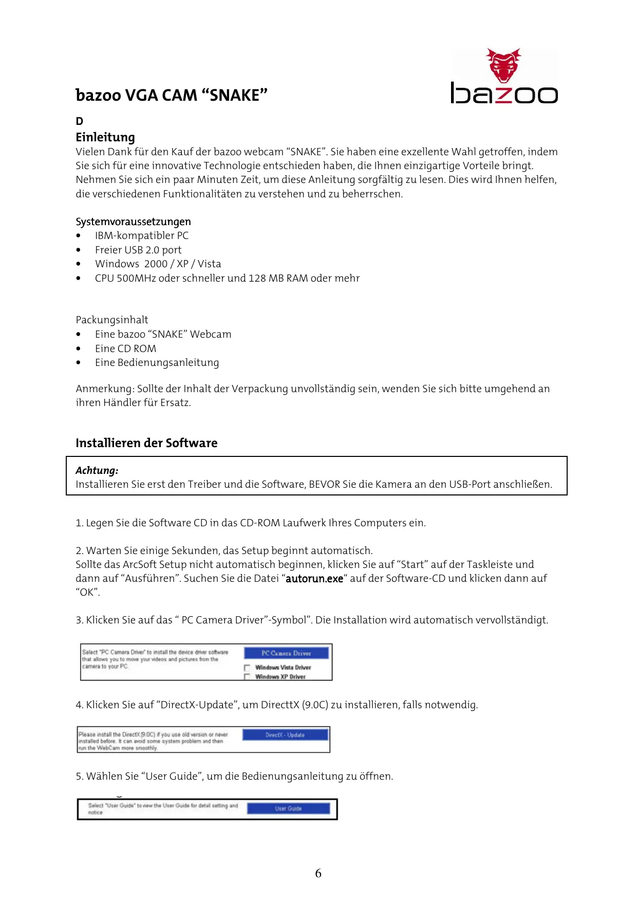 Vielen Dank für den Kauf der bazoo webcam "SNAKE". Sie haben eine exzellente Wahl getroffen, indem Sie sich für eine innovative Technologie entschieden haben, die ihren einzigartige Vorteile bringt.