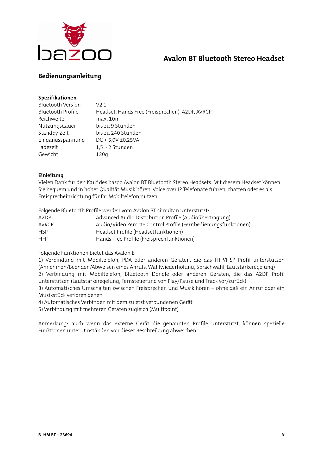 Vielen Dank für den Kauf des bazoo Avalon BT Bluetooth Stereo Headsets. Mit diesen Headset können Sie bequem und in hoher Qualität Musik horen, Voice over IP Telefonate führen, chatten oder es als Freisprecheinrichtung für Ihr Mobiltelefon nutzen.