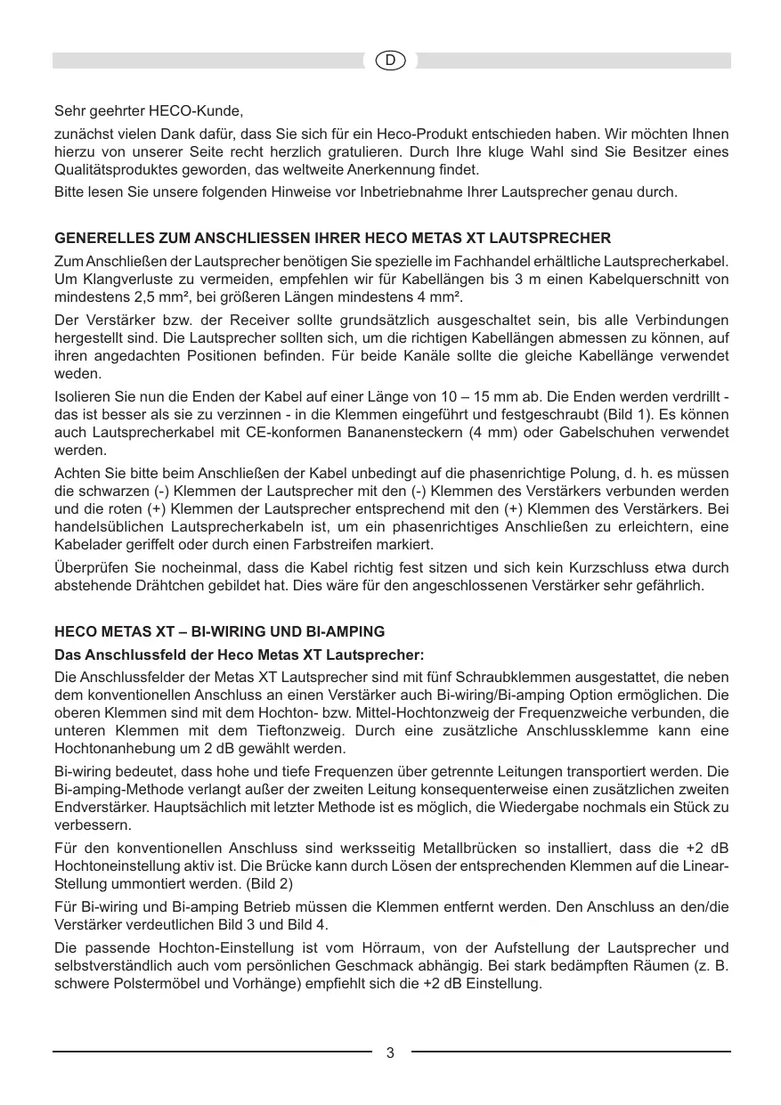 Sehr geehrter HECO-Kunde, zunächst vielen Dank dafür, dass Sie sich für ein Heco-Produkt entschieden haben. Wir möchten Ihnen hierzu von unserer Seite recht herzlich gratulieren. Durch Ihre kluge Wahl sind Sie Besitzer eines Qualitätsproduktes geworden, das weltweite Anerkennung findet. Bitte lesen Sie unsere folgenden Hinweise vor Inbetriebnahme Ihrer Lautsprecher genau durch. GENERELLES ZUM ANSCHLIESSEN IHRER HECO METAS XT LAUTSPRECHER Zum Anschließen der Lautsprecher benötigen Sie spezielle im Fachhandel erhältliche Lautsprecherkabel. Um Klangverluste zu vermeiden, empfehlen wir für Kabellängen bis 3 m einen Kabelquerschnitt von mindestens 2,5 mm², bei größeren Längen mindestens 4 mm². Der Verstärker bzw. der Receiver sollte grundsätzlich ausgeschaltet sein, bis alle Verbindungen hergestellt sind. Die Lautsprecher sollten sich, um die richtigen Kabellängen abmessen zu können, auf ihren angedachten Positionen befinden. Für beide Kanäle sollte die gleiche Kabellänge verwendet weden. Isolieren Sie nun die Enden der Kabel auf einer Länge von 10 – 15 mm ab. Die Enden werden verdrillt das ist besser als sie zu verzinnen - in die Klemmen eingeführt und festgeschraubt (Bild 1). Es können auch Lautsprecherkabel mit CE-konformen Bananensteckern (4 mm) oder Gabelschuhen verwendet werden. Achten Sie bitte beim Anschließen der Kabel unbedingt auf die phasenrichtige Polung, d. h. es müssen die schwarzen (-) Klemmen der Lautsprecher mit den (-) Klemmen des Verstärkers verbunden werden und die roten (+) Klemmen der Lautsprecher entsprechend mit den (+) Klemmen des Verstärkers. Bei handelsüblichen Lautsprecherkabeln ist, um ein phasenrichtiges Anschließen zu erleichtern, eine Kabelader geriffelt oder durch einen Farbstreifen markiert. Überprüfen Sie nocheinmal, dass die Kabel richtig fest sitzen und sich kein Kurzschluss etwa durch abstehende Drähtchen gebildet hat. Dies wäre für den angeschlossenen Verstärker sehr gefährlich.