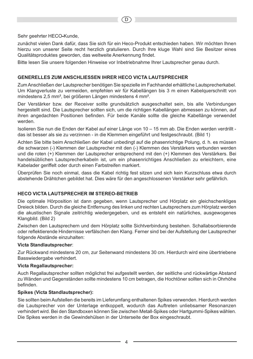 Sehr geehrter HECO-Kunde, zunächst vielen Dank dafür, dass Sie sich für ein Heco-Produkt entschieden haben. Wir möchten Ihnen hierzu von unserer Seite recht herzlich gratulieren. Durch Ihre kluge Wahl sind Sie Besitzer eines Qualitätsproduktes geworden, das weltweite Anerkennung findet. Bitte lesen Sie unsere folgenden Hinweise vor Inbetriebnahme Ihrer Lautsprecher genau durch. GENERELLES ZUM ANSCHLIESSEN IHRER HECO VICTA LAUTSPRECHER Zum Anschließen der Lautsprecher benötigen Sie spezielle im Fachhandel erhältliche Lautsprecherkabel. Um Klangverluste zu vermeiden, empfehlen wir für Kabellängen bis 3 m einen Kabelquerschnitt von mindestens 2,5 mm², bei größeren Längen mindestens 4 mm². Der Verstärker bzw. der Receiver sollte grundsätzlich ausgeschaltet sein, bis alle Verbindungen hergestellt sind. Die Lautsprecher sollten sich, um die richtigen Kabellängen abmessen zu können, auf ihren angedachten Positionen befinden. Für beide Kanäle sollte die gleiche Kabellänge verwendet werden. Isolieren Sie nun die Enden der Kabel auf einer Länge von 10 – 15 mm ab. Die Enden werden verdrillt das ist besser als sie zu verzinnen - in die Klemmen eingeführt und festgeschraubt. (Bild 1) Achten Sie bitte beim Anschließen der Kabel unbedingt auf die phasenrichtige Polung, d. h. es müssen die schwarzen (-) Klemmen der Lautsprecher mit den (-) Klemmen des Verstärkers verbunden werden und die roten (+) Klemmen der Lautsprecher entsprechend mit den (+) Klemmen des Verstärkers. Bei handelsüblichen Lautsprecherkabeln ist, um ein phasenrichtiges Anschließen zu erleichtern, eine Kabelader geriffelt oder durch einen Farbstreifen markiert. Überprüfen Sie noch einmal, dass die Kabel richtig fest sitzen und sich kein Kurzschluss etwa durch abstehende Drähtchen gebildet hat. Dies wäre für den angeschlossenen Verstärker sehr gefährlich.