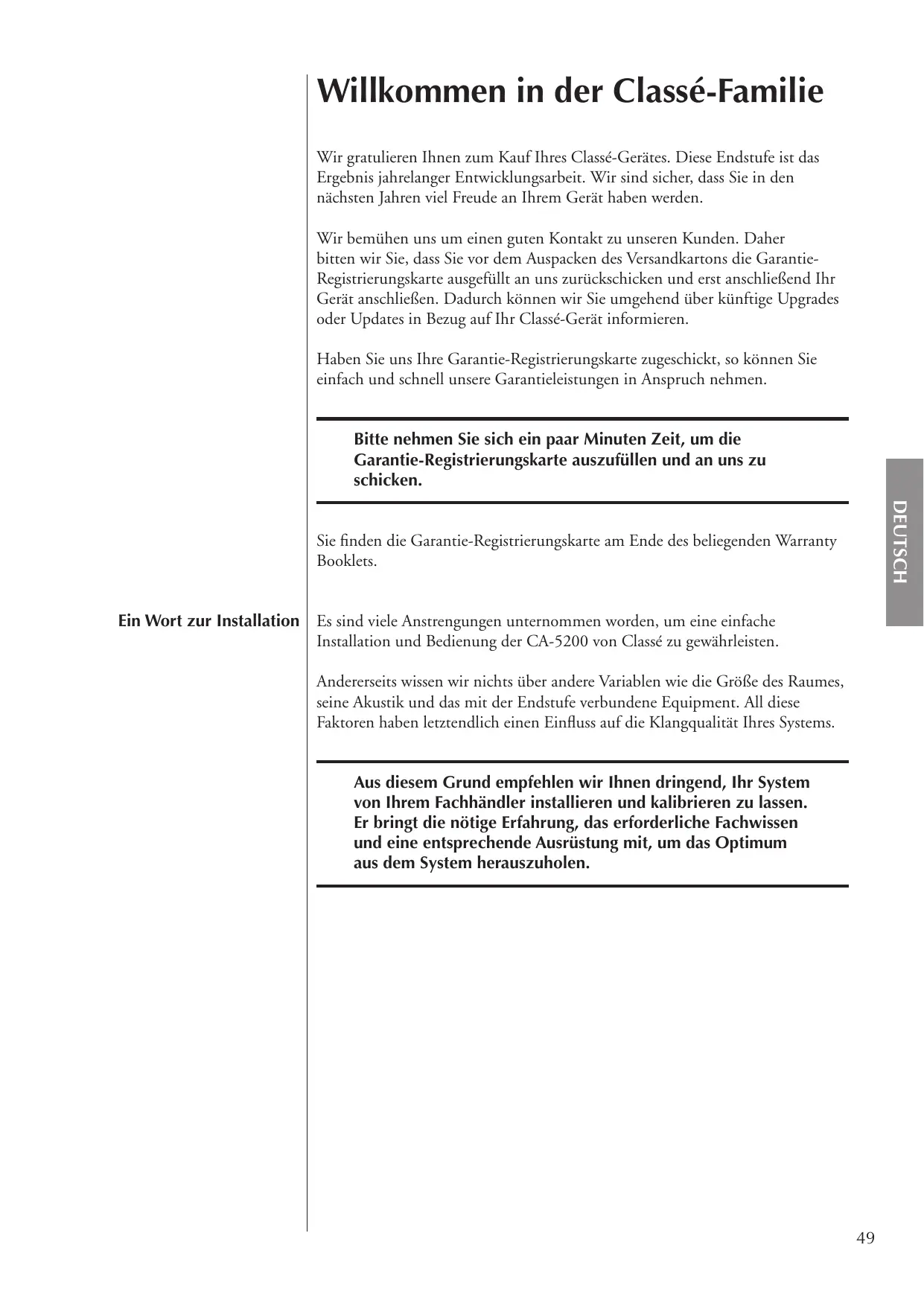 Es sind viele Anstrengungen unternommen worden, um eine einfache Installation und Bedienung der CA-5200 von Classé zu gewährleisten. Andererseits wissen wir nichts über andere Variablen wie die GrôRe des Raumes, seine Akustik und das mit der Endstufe verbundene Equipment. All diese Faktoren haben letztendlich einen Einfluss auf die Klangqualität Ihres Systems. Aus diesem Grund empfehlen wir Ihnen dringend, Ihr System von lhrem Fachhändler installieren und kalibrieren zu lassen. Er bringt die nôtige Erfahrung, das erforderliche Fachwissen und eine entsprechende Ausrüstung mit, um das Optimum aus dem System herauszuholen.