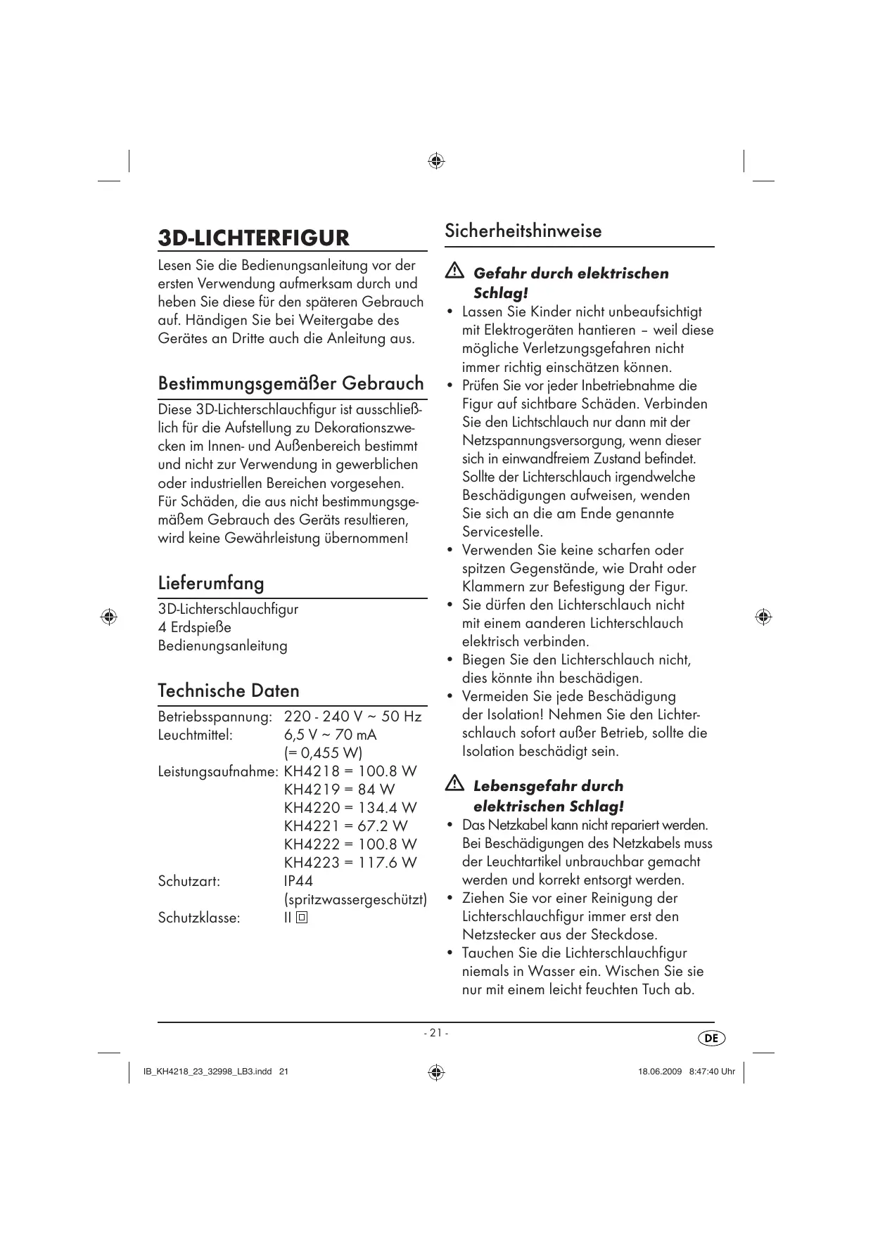 Lesen Sie die Bedienungsanleitung vor der ersten Verwendung aufmerksam durch und heben Sie diese für den späteren Gebrauch auf. Händigen Sie bei Weitergabe des Gerätes an Dritte auch die Anleitung aus. Bestimmungsgemäfier Gebrauch Diese 3D-Lichterschlauchfigur ist ausschlieB- lich für die Aufstellung zu Dekorationszwe- cken im Innen- und AuBenbereich bestimmt und nicht zur Verwendung in gewerblichen oder industriellen Bereichen vorgesehen. Für Schäden, die aus nicht bestimmungsge- mäBem Gebrauch des Geräts resultieren, wird keine Gewährleistung übernomment! Lieferumfang 3D-ichterschlauchfigur 4 ErdspieBe Bedienungsanleitung Technische Daten Betriebsspannung: 220 - 240 V - 50 Hz Leuchtmittel: 6,5V - 70 mA (= 0,455 W) Leistungsaufnahme: KH4218 = 100.8 W KH4219=84W KH4220 = 1344W KH422 672W KH4222 = 100.8 W KH4223 =1176W Schutzart: IP44 (spritzwassergeschützt) Schutzklasse: Re Sicherheitshinweise À Gefahr durch elektrischen Schlag! +_Lassen Sie Kinder nicht unbeaufsichtigt mit Elektrogeräten hantieren - weil diese môgliche Verletzungsgefahren nicht immer richtig einschätzen kônnen. +_ Prüfen Sie vor jeder Inbetriebnahme die Figur auf sichtbare Schäden. Verbinden Sie den Lichtschlauch nur dann mit der Netzspannungsversorgung, wenn dieser sich in einwandfreiem Zustand befindet. Sollte der Lichterschlauch irgendwelche Beschädigungen aufweisen, wenden Sie sich an die am Ende genannte Servicestelle. + Verwenden Sie keine scharfen oder spitzen Gegenstände, wie Draht oder Klammern zur Befestigung der Figur. + Sie dürfen den Lichterschlauch nicht mit einem aanderen Lichterschlauch 7 elektrisch verbinden. + Biegen Sie den Lichterschlauch nicht, dies kônnte ihn beschädigen. + Vermeiden Sie jede Beschädigung der Isolation! Nehmen Sie den Lichter- schlauch sofort auBer Betrieb, sollte die Isolation beschädigt sein. À Lebensgefahr durch elektrischen Schlag! +_ Das Netzkabel kann nicht repariert werden. Bei Beschädigungen des Netzkabels muss der Leuchtartikel unbrauchbar gemacht werden und korrekt entsorgt werden. +_Ziehen Sie vor einer Reinigung der Lichterschlauchfigur immer erst den Netzstecker aus der Steckdose. Tauchen Sie die Lichterschlauchfigur niemals in Wasser ein. Wischen Sie sie nur mit einem leicht feuchten Tuch ab.