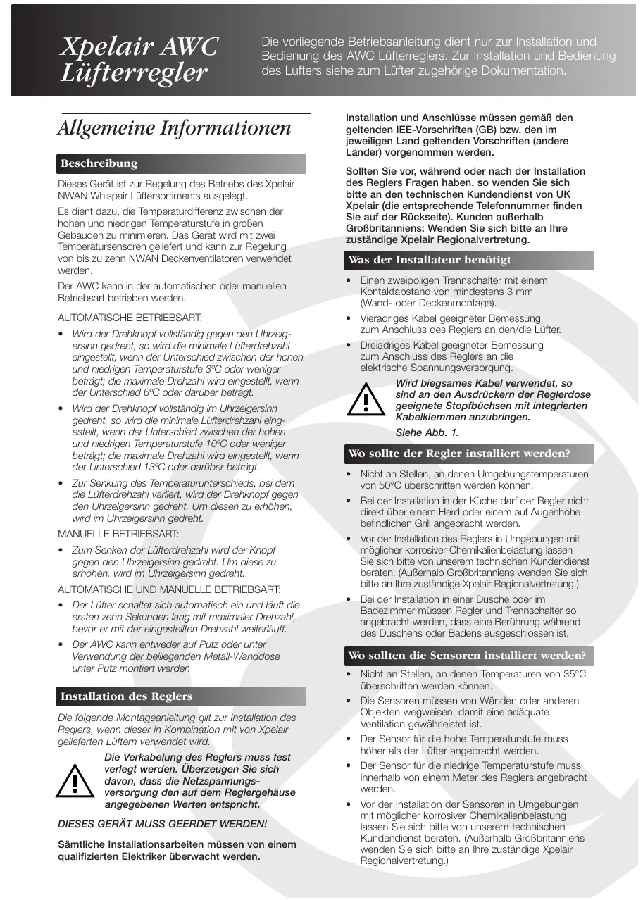 Xpelair AWC Lüfterregler des Lüfters siehe zum Lüfter zugehôrige Dokumentation Allgemeine Informationen Dieses Gerät ist zur Regelung des Betriebs des Xpelair NWAN Whispair Lüftersortiments ausgelegt. Es dient dazu, die Temperaturdifferenz zwischen der hohen und niedrigen Temperaturstufe in groBen Gebäuden zu minimieren. Das Gerät wird mit zwei Temperatursensoren geliefert und kann zur Regelung von bis zu zehn NWAN Deckenventiatoren verwendet werden. Der AWC kann in der automatischen oder manuellen Betriebsart betrieben werden. AUTOMATISCHE BETRIEBSART: + Wird der Drehknopf volständig gegen den Uhrzeig- ersinn gedreht, so wird die minimale Lüfterarehzahl eingestell, wenn der Unterschied zwischen der hohen und niedrigen Temperaturstufe &°C oder weniger beträgt: die maximale Drehzahl wird eingestelt, wenn der Unterschied 6°C oder darüber beträgt. Wir der Drehknopf volständig im Uhrzeigersinn gedreht, so wird die minimale Lüfterdrehzahl eing- estelt, wenn der Unterschied zwischen der hohen und niedrigen Temperaturstufe 10°C oder weniger. beträgt: die maximale Drehzahl wird eingestelt, wenn der Unterschied 1&C oder darüber beträgt. Zur Senkung des Temperaturunterschieds, bei dem die Lüfterdrehzahl variert, wird der Drehknopf gegen den Uhrzeigersinn gedreht. Um diesen zu erhôhen, wird im Uhrzeigersinn gedreht. MANUELLE BETRIEBSART: + Zum Senken der Lüfterdrehzahl wird der Knopf gegen den Uhrzeïgersinn gedreht. Um diese zu erhôhen, wird im Uhrzeigersinn geateht. AUTOMATISCHE UND MANUELLE BETRIEBSART: +_ Der Lüfter schaltet sich automatisch ein und läuft die ersten zehn Sekunden lang mit maximaler Drehzahl bevor er mit der eingestelten Drehzahl weiterläuft. +_ Der AWC kann entweder auf Putz oder unter Venwendung der bellegenden Metal-Wanddose unter Putz montiert werden Die folgende Montageanieitung gil zur Installation des Reglers, wenn dieser in Kombination mit von Xpelair gelieferten Lüftem verwendet wird. Die Verkabelung des Reglers muss fest verlegt werden. Überzeugen Sie sich davon, dass die Netzspannungs- versorgung den auf dem Reglergehäuse angegebenen Werten entspricht. DIESES GERÂT MUSS GEERDET WERDEN! Sämtliche Installationsarbeiten müssen von einem qualifizierten Elektriker überwacht werden. Installation und Anschlüsse müssen gemäB den geltenden IEE-Vorschriften (GB) bzw. den im jeweiligen Land geltenden Vorschriften (andere Länder) vorgenommen werden. Soliten Sie vor, während oder nach der Installation des Reglers Fragen haben, so wenden Sie sich bitte an den technischen Kundendienst von UK Xpelair (die entsprechende Telefonnummer finden Sie auf der Rückseite). Kunden auBerhalb GroBbritanniens: Wenden Sie sich bitte an Ihre zuständige Xpelair Regionalvertretung. Was der Installateur benôtigt Einen zweipoligen Trennschalter mit einem Kontaktabstand von mindestens 3 mm {Wand- oder Deckenmontage) Vieradiges Kabel gesigneter Bemessung zum Anschluss des Reglers an den/die Lüfter Dreiacriges Kabel geeigneter Bemessung zum Anschluss des Reglers an die elektrische Spannungsversorgung. Wird biegsames Kabel verwendet, so À sind an den Ausdrückern der Reglerdose geeignete Stopfbächsen mit integrierten Kabelklemmen anzubringen. Siehe Abb. 1. Wo sollte der Regler installiertwerdent Nicht an Stellen, an denen Umgebungstemperaturen von 50°C überschritten werden kënnen. Bei der Installation in der Küche clarf der Regler nicht: direkt über einem Herci oder einem auf Augenhôhe befindichen Gril angebracht werden. Vor der Installation des Reglers in Umgebungen mit môglicher korrosiver Chemikalienbeastung lassen Sie Sich bitte von unserem technischen Kundendienst beraten. (AuBerhalb Grofbritanniens wenden Sie sich bitte an Ihre zuständige Xpelair Regionalvertretung } Bi der Installation in einer Dusche oder im Badezimmer müssen Regler und Trennschalter so angebracht werden, dass eine Berührung während des Duschens oder Badens ausgeschlossen ist. oren installiert Werdei +_Nicht an Stellen, an denen Temperaturen von 35°C überschritten werden Kônnen. Die Sensoren müssen von Wänden oder anderen Objekten wegweisen, damit eine adäquate Ventilation gewährleistet ist. Der Sensor für die hohe Temperaturstufe muss hôher ais der Lüfter angebracht werden. Der Sensor für die niedrige Temperaturstufe muss innerhalb von einem Meter des Reglers angebracht werden. Vor der Installation der Sensoren in Umgebungen mit môglcher korrosiver Chemikalienbelastung lassen Sie sich bitte von unserem technischen Kündendienst beraten. (AuBerhalb GroBbritanniens wenden Sie sich bitte an Ihre zuständige Xpelair RegionalWvertretung.)