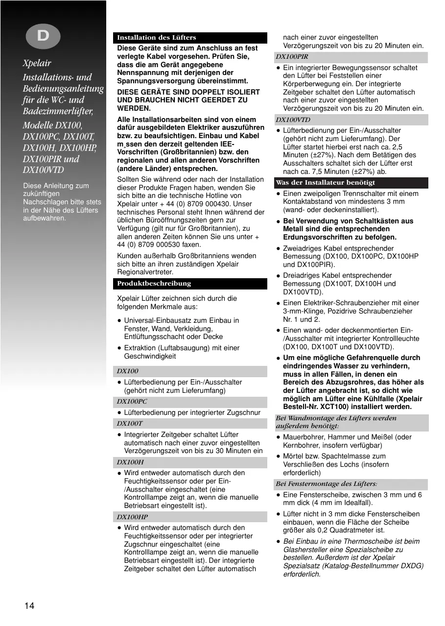 Xpelair Installations- und Bedienungsanleitung für die WC- und Badezimmerlüfter, Modelle DX100, DX100PC, DX100T, DX100H, DX100HP. DX100PIR und DX100VID Diese Anleitung zum zukünftigen Nachschlagen bitte stets in der Nähe des Lüfters aufbewahren.