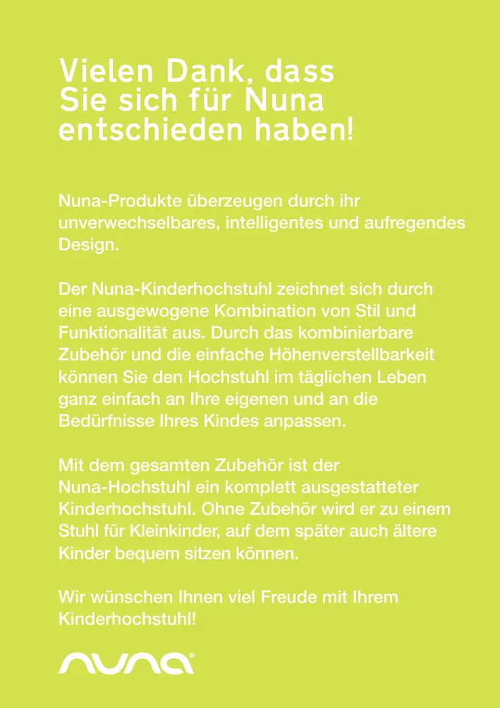 Vielen Dank, dass Sie sich für Nuna entschieden haben! Nuna-Produkte überzeugen durch ihr unverwechselbares, intelligentes und aufregendes Design. Der Nuna-Kinderhochstuhl zeichnet sich durch eine ausgewogene Kombination von Stil und Funktionalität aus. Durch das kombinierbare Zubehör und die einfache Höhenverstellbarkeit können Sie den Hochstuhl im täglichen Leben ganz einfach an Ihre eigenen und an die Bedürfnisse Ihres Kindes anpassen. Mit dem gesamten Zubehör ist der Nuna-Hochstuhl ein komplett ausgestatteter Kinderhochstuhl. Ohne Zubehör wird er zu einem Stuhl für Kleinkinder, auf dem später auch ältere Kinder bequem sitzen können. Wir wünschen Ihnen viel Freude mit Ihrem Kinderhochstuhl! Inhalt Abbildungen 1-3 Deutsch (DE)