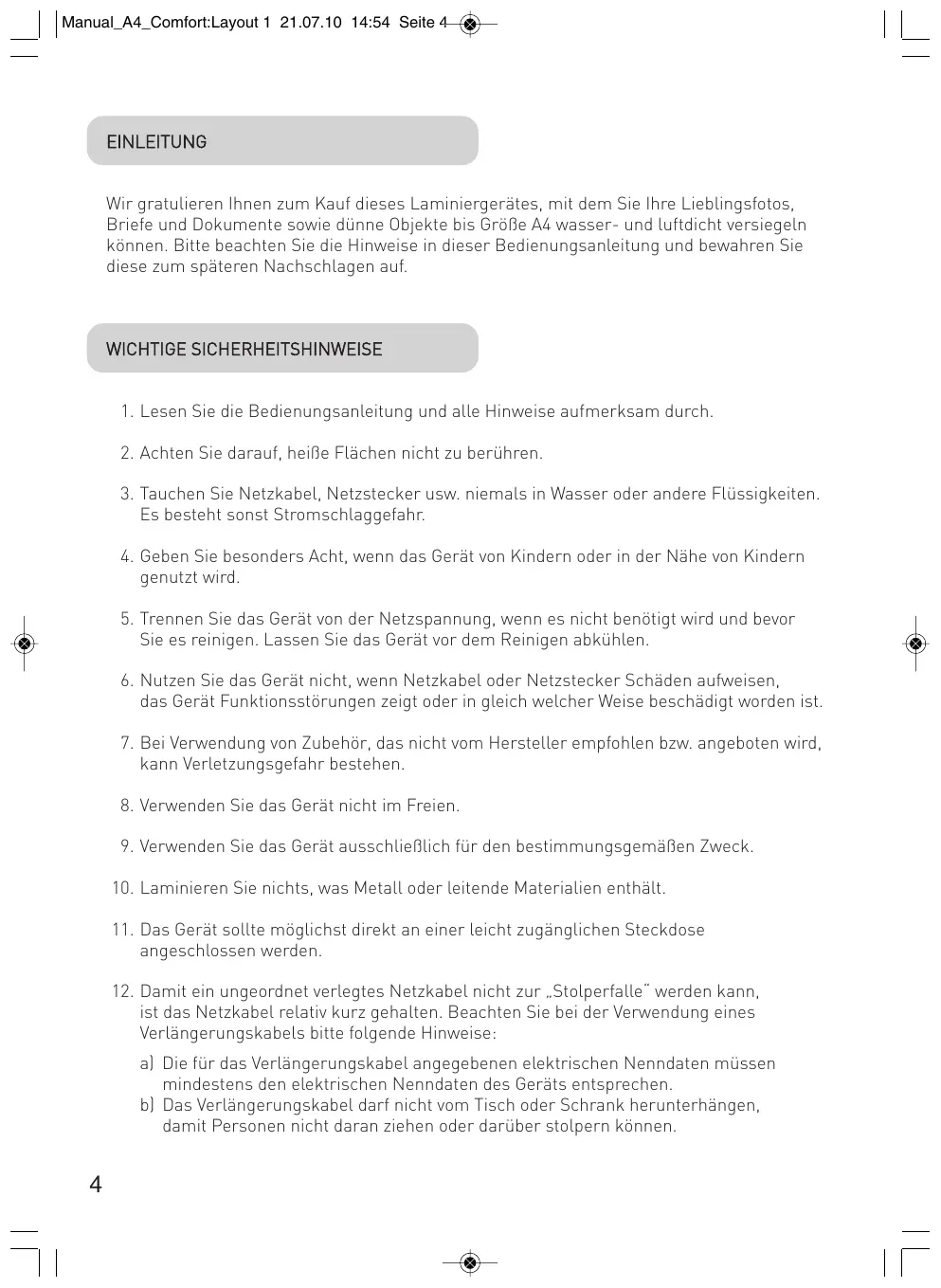 Manual_A4_Comfort:Layout 1 21.07.10 14:54 Seite 4 EINLEITUNG Wir gratulieren Ihnen zum Kauf dieses Laminiergerätes, mit dem Sie Ihre Lieblingsfotos, Briefe und Dokumente sowie dünne Objekte bis Größe A4 wasser- und luftdicht versiegeln können. Bitte beachten Sie die Hinweise in dieser Bedienungsanleitung und bewahren Sie diese zum späteren Nachschlagen auf. WICHTIGE SICHERHEITSHINWEISE