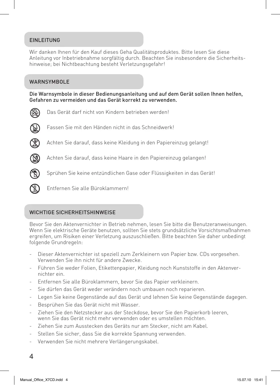 Laden Sie die Anleitung für Ihr Aktenvernichter kostenlos im PDF-Format! Finden Sie Ihr Handbuch OFFICE X7 CD - GEHA und nehmen Sie Ihr elektronisches Gerät wieder in die Hand. Auf dieser Seite sind alle Dokumente veröffentlicht, die für die Verwendung Ihres Geräts notwendig sind. OFFICE X7 CD von der Marke GEHA.