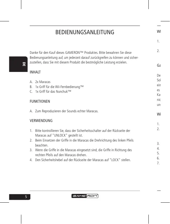Danke für den Kauf dieses GAMERON™ Produktes. Bitte bewahren Sie diese Bedienungsanleitung auf, um jederzeit darauf zurückgreifen zu können und sicherzustellen, dass Sie mit diesem Produkt die bestmögliche Leistung erzielen. INHALT A. 2x Maracas B. 1x Griff für die Wii-Fernbedienung™ C. 1x Griff für das Nunchuk™ FUNKTIONEN A. Zum Reproduzieren der Sounds echter Maracas. VERWENDUNG