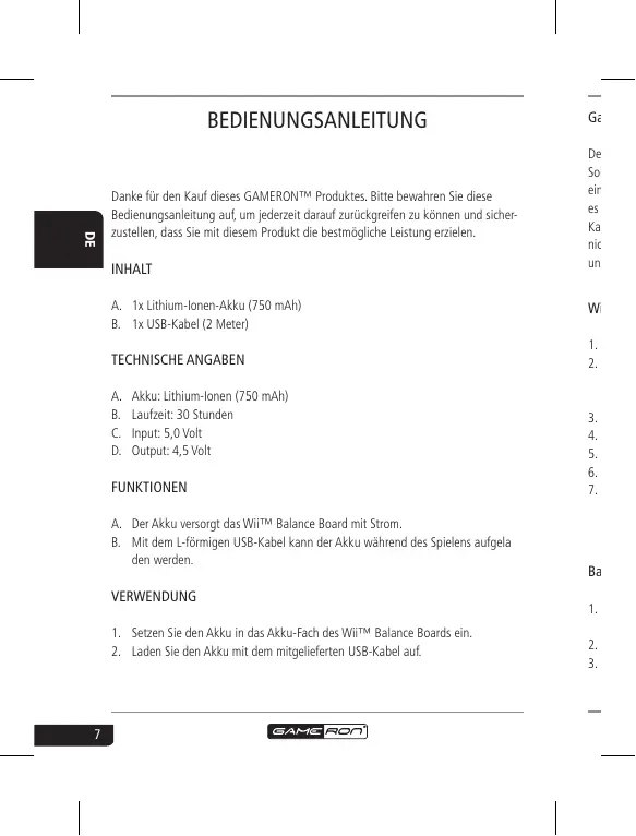 BEDIENUNGSANLEITUNG Garantie Danke für den Kauf dieses GAMERON™ Produktes. Bitte bewahren Sie diese Bedienungsanleitung auf, um jederzeit darauf zurückgreifen zu können und sicherzustellen, dass Sie mit diesem Produkt die bestmögliche Leistung erzielen. Der Garan Sollte in d ein Defekt es erworb Kaufbeleg nicht für D unsachgem INHALT A. 1x Lithium-Ionen-Akku (750 mAh) B. 1x USB-Kabel (2 Meter) TECHNISCHE ANGABEN