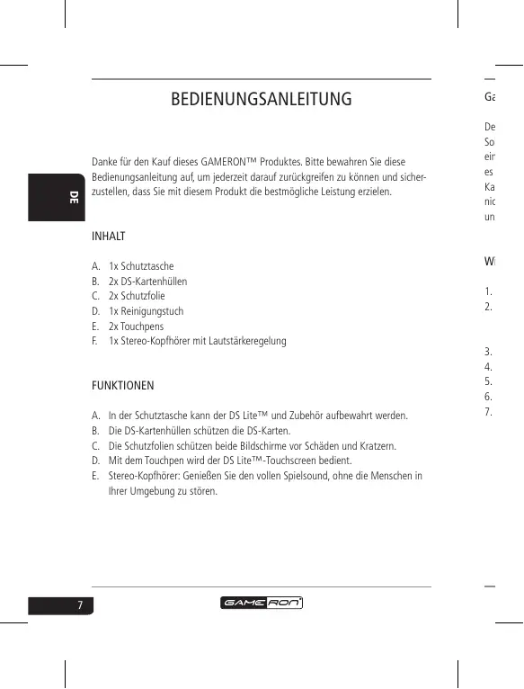 BEDIENUNGSANLEITUNG Garantie Danke für den Kauf dieses GAMERON™ Produktes. Bitte bewahren Sie diese Bedienungsanleitung auf, um jederzeit darauf zurückgreifen zu können und sicherzustellen, dass Sie mit diesem Produkt die bestmögliche Leistung erzielen. Der Garan Sollte in d ein Defekt es erworb Kaufbeleg nicht für D unsachgem INHALT