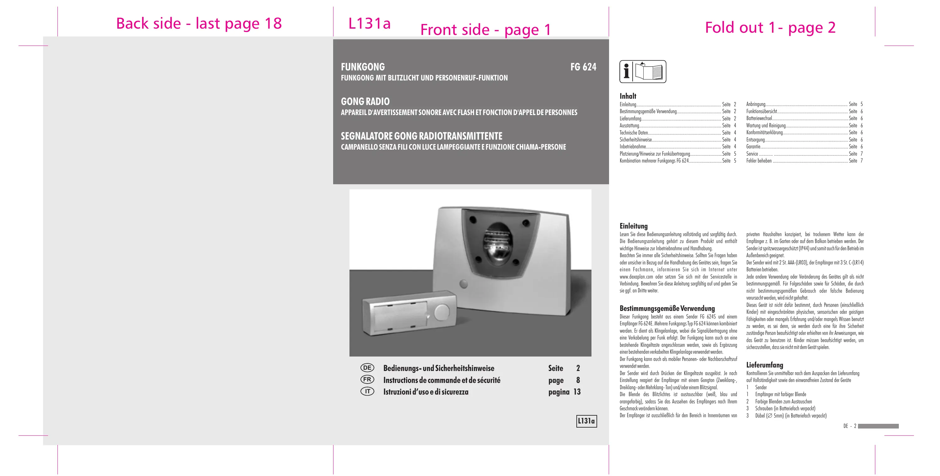 Dieser Funkgong besteht aus einem Sender FG 624S und einem Empfänger FG 624E. Mehrere Funkgongs Typ FG 624 konnen kombiniert werden. Er dient als Klingelanlage, wobei die Signalübertragung ohne eine Verkabelung per Funk erfolgt. Der Funkgong kann auch an eine bestehende Klingeltaste angeschlossen werden, sowie als Ergänzung einer bestehenden verkabelten Klingelanlage verwendet werden.