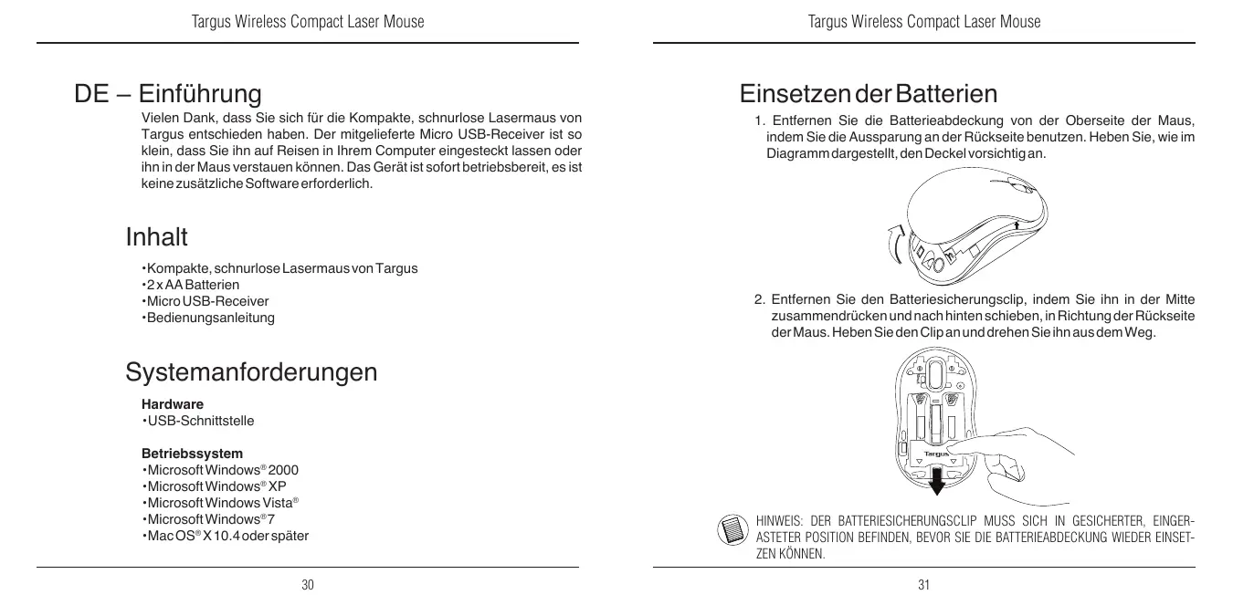 BEDIENUNGSANLEITUNG WIRELESS COMPACT LASER MOUSE TARGUS