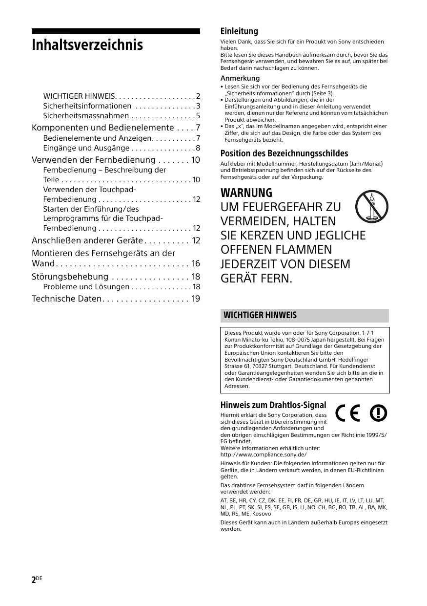 GERÄT FERN. Technische Daten. . . . . . . . . . . . . . . . . . . 19 WICHTIGER HINWEIS Dieses Produkt wurde von oder für Sony Corporation, 1-7-1 Konan Minato-ku Tokio, 108-0075 Japan hergestellt. Bei Fragen zur Produktkonformität auf Grundlage der Gesetzgebung der Europäischen Union kontaktieren Sie bitte den Bevollmächtigten Sony Deutschland GmbH, Hedelfinger Strasse 61, 70327 Stuttgart, Deutschland. Für Kundendienst oder Garantieangelegenheiten wenden Sie sich bitte an die in den Kundendienst- oder Garantiedokumenten genannten Adressen. Hinweis zum Drahtlos-Signal Hiermit erklärt die Sony Corporation, dass sich dieses Gerät in Übereinstimmung mit den grundlegenden Anforderungen und den übrigen einschlägigen Bestimmungen der Richtlinie 1999/5/ EG befindet. Weitere Informationen erhältlich unter: http://www.compliance.sony.de/ Hinweis für Kunden: Die folgenden Informationen gelten nur für Geräte, die in Ländern verkauft werden, in denen EU-Richtlinien gelten. Das drahtlose Fernsehsystem darf in folgenden Ländern verwendet werden: AT, BE, HR, CY, CZ, DK, EE, FI, FR, DE, GR, HU, IE, IT, LV, LT, LU, MT, NL, PL, PT, SK, SI, ES, SE, GB, IS, LI, NO, CH, BG, RO, TR, AL, BA, MK, MD, RS, ME, Kosovo Dieses Gerät kann auch in Ländern außerhalb Europas eingesetzt werden. 2DE Sicherheitsinformationen WARNUNG Batterien dürfen nicht übermäßiger Hitze, wie Sonnenlicht, einem Feuer oder Ähnlichem, ausgesetzt werden. Installation/Einstellung Installieren und benutzen Sie das Fernsehgerät unter Berücksichtigung der im Folgenden angegebenen Anweisungen, um alle Risiken wie Feuer, Stromschlag oder Beschädigungen und/oder Verletzungen zu vermeiden. Luftzirkulation