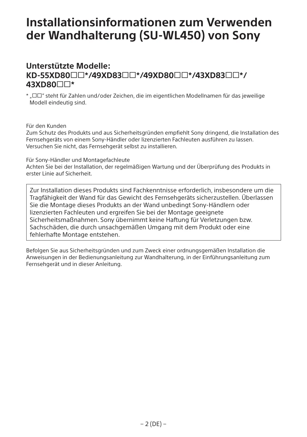 A l’attention des installateurs et revendeurs Sony Soyez particulièrement attentif à la sécurité pendant l’installation, l’entretien périodique et l’examen du produit.