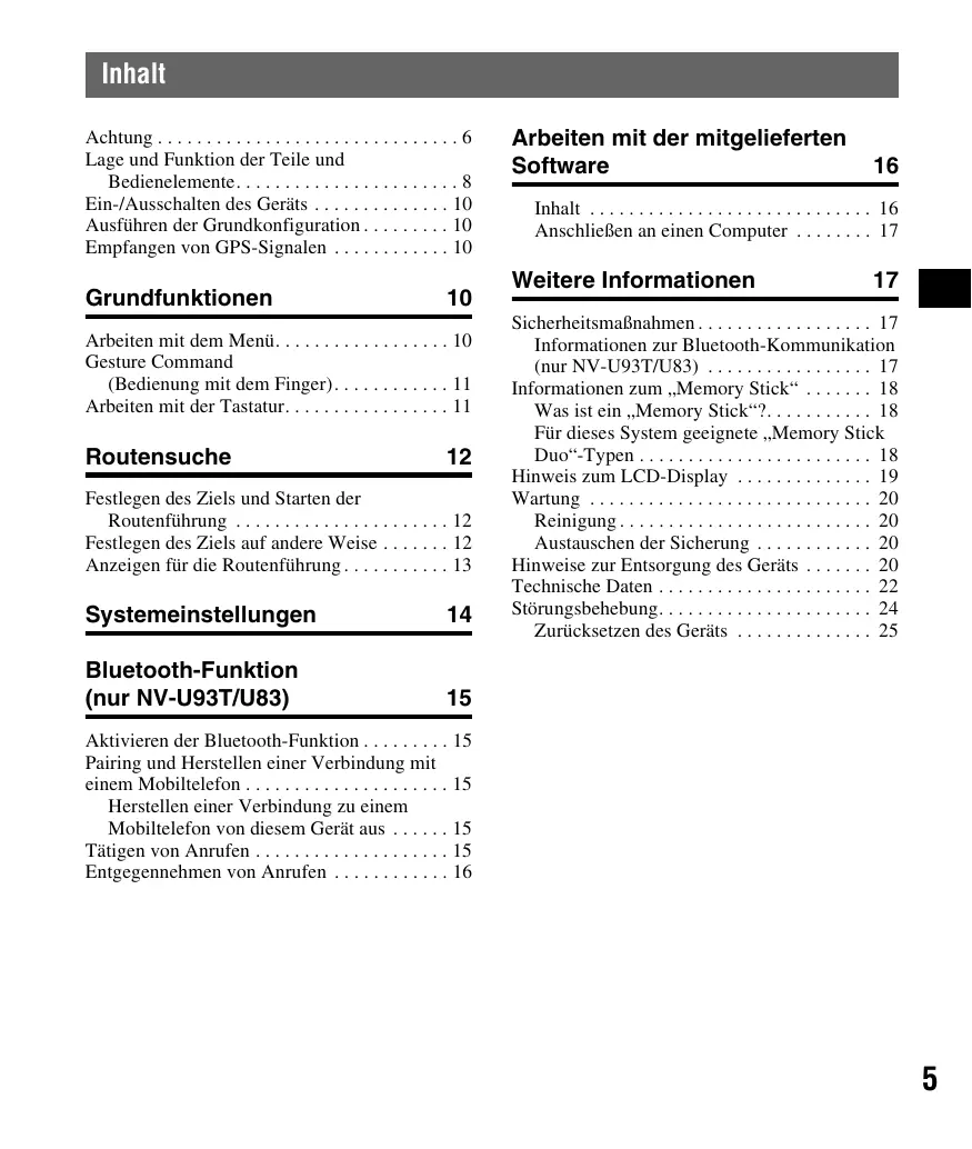 - Zwischen hohen Bäumen mit dichtem Laubwerk Hinweis Der GPS-Signalempfang ist je nach Material der Windschutzscheibe am Fahrzeug unter Umständen nicht gut. WICHTIGER HINWEIS zur BluetoothFunktion! (nur NV-U93T/U83) Sicherer und effizienter Gebrauch Jegliche Änderungen am Gerät, die ohne die ausdrückliche Genehmigung von Sony durchgeführt werden, können die Befugnis des Betreibers zur Verwendung des Geräts aufheben. Bitte überprüfen Sie vor dem Gebrauch dieses Produkts, ob es auf nationaler Ebene Vorschriften oder Bestimmungen gibt, die die Verwendung von Bluetooth-Geräten einschränken. Führen von Fahrzeugen Das Positionsbestimmungssystem (POSITION plus) (nur NV-U93T/U83) Dieses System ist mit einer Funktion ausgestattet, mit der der Standort des Fahrzeugs korrekt angezeigt werden kann, selbst wenn es sich an einer Stelle befindet, an der das GPS-Signal vorübergehend gar nicht oder nur schlecht empfangen werden kann, zum Beispiel in einer Unterführung. Um diese Funktion einzuschalten, gehen Sie folgendermaßen vor: – Setzen Sie das Gerät auf die Anschlussstation. – Fahren Sie eine Weile in einer Gegend, in der das GPS-Signal gut zu empfangen ist. Das Positionsbestimmungssystem ist betriebsbereit, nachdem Sie eine Zeit lang mit eingeschaltetem Gerät gefahren sind. Hinweise