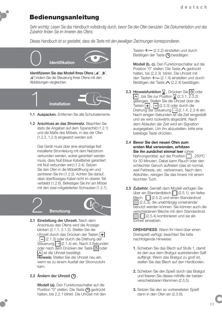 Tasten / (2.2.2) einstellen und durch Betätigen der Taste bestätigen. Identifikation Identifizieren Sie das Modell Ihres Ofens („a”, „b”, „c”) indem Sie die Steuerung Ihres Ofens mit den Abbildungen vergleichen.