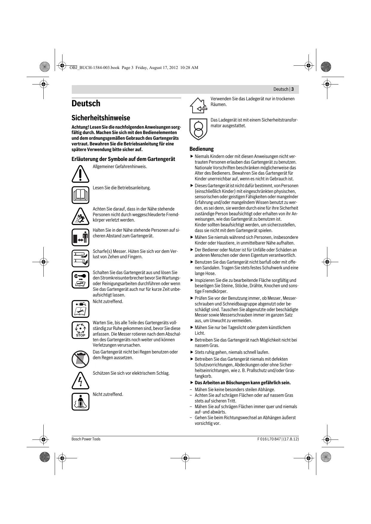 Polski . . . . . . . . . . . . . . . . . . . . . . . . . . . . . . . . . . . . . . . . . .Strona 105 Česky . . . . . . . . . . . . . . . . . . . . . . . . . . . . . . . . . . . . . . . . . . Strana 114 Slovensky. . . . . . . . . . . . . . . . . . . . . . . . . . . . . . . . . . . . . . . Strana 121 Magyar . . . . . . . . . . . . . . . . . . . . . . . . . . . . . . . . . . . . . . . . . . Oldal 129 Ðóññêèé . . . . . . . . . . . . . . . . . . . . . . . . . . . . . . . . . . . . . Ñòðàíèöà 137 Óêðà¿íñüêà. . . . . . . . . . . . . . . . . . . . . . . . . . . . . . . . . . . .Ñòîð³íêà 146 Română . . . . . . . . . . . . . . . . . . . . . . . . . . . . . . . . . . . . . . . .Pagina 154 Áúëãàðñêè . . . . . . . . . . . . . . . . . . . . . . . . . . . . . . . . . . . Ñòðàíèöà 163 Srpski. . . . . . . . . . . . . . . . . . . . . . . . . . . . . . . . . . . . . . . . . . Strana 171 Slovensko . . . . . . . . . . . . . . . . . . . . . . . . . . . . . . . . . . . . . . . Stran 180 Hrvatski . . . . . . . . . . . . . . . . . . . . . . . . . . . . . . . . . . . . . . Stranica 187 Eesti . . . . . . . . . . . . . . . . . . . . . . . . . . . . . . . . . . . . . . . . . Lehekülg 194 Latviešu . . . . . . . . . . . . . . . . . . . . . . . . . . . . . . . . . . . . . . Lappuse 201 Lietuviškai . . . . . . . . . . . . . . . . . . . . . . . . . . . . . . . . . . . . Puslapis 209 vc . . . . . . . . . . . . . . . . . . . . . . . . . . . . . . . . . . . . vÝ—U . . . . . . . . . . . . . . . . . . . . . . . . . . . . . . . . . . . F 016 L70 847 | (17.8.12) ΔΤϔλ 225 ϪΤϔλ 233 Bosch Power Tools OBJ_BUCH-1584-003.book Page 3 Friday, August 17, 2012 10:28 AM Deutsch | 3 Deutsch Sicherheitshinweise Achtung! Lesen Sie die nachfolgenden Anweisungen sorgfältig durch. Machen Sie sich mit den Bedienelementen und dem ordnungsgemäßen Gebrauch des Gartengeräts vertraut. Bewahren Sie die Betriebsanleitung für eine spätere Verwendung bitte sicher auf. Erläuterung der Symbole auf dem Gartengerät Allgemeiner Gefahrenhinweis. Lesen Sie die Betriebsanleitung. Achten Sie darauf, dass in der Nähe stehende Personen nicht durch weggeschleuderte Fremdkörper verletzt werden. Halten Sie in der Nähe stehende Personen auf sicheren Abstand zum Gartengerät. Scharfe(s) Messer. Hüten Sie sich vor dem Verlust von Zehen und Fingern. Schalten Sie das Gartengerät aus und lösen Sie den Stromkreisunterbrecher bevor Sie Wartungsoder Reinigungsarbeiten durchführen oder wenn Sie das Gartengerät auch nur für kurze Zeit unbeaufsichtigt lassen. Nicht zutreffend. STOP Warten Sie, bis alle Teile des Gartengeräts vollständig zur Ruhe gekommen sind, bevor Sie diese anfassen. Die Messer rotieren nach dem Abschalten des Gartengeräts noch weiter und können Verletzungen verursachen. Das Gartengerät nicht bei Regen benutzen oder dem Regen aussetzen. Schützen Sie sich vor elektrischem Schlag. Nicht zutreffend. Bosch Power Tools Verwenden Sie das Ladegerät nur in trockenen Räumen. Das Ladegerät ist mit einem Sicherheitstransformator ausgestattet. Bedienung f Niemals Kindern oder mit diesen Anweisungen nicht vertrauten Personen erlauben das Gartengerät zu benutzen. Nationale Vorschriften beschränken möglicherweise das Alter des Bedieners. Bewahren Sie das Gartengerät für Kinder unerreichbar auf, wenn es nicht in Gebrauch ist. f Dieses Gartengerät ist nicht dafür bestimmt, von Personen (einschließlich Kinder) mit eingeschränkten physischen, sensorischen oder geistigen Fähigkeiten oder mangelnder Erfahrung und/oder mangelndem Wissen benutzt zu werden, es sei denn, sie werden durch eine für ihre Sicherheit zuständige Person beaufsichtigt oder erhalten von ihr Anweisungen, wie das Gartengerät zu benutzen ist. Kinder sollten beaufsichtigt werden, um sicherzustellen, dass sie nicht mit dem Gartengerät spielen. f Mähen Sie niemals während sich Personen, insbesondere Kinder oder Haustiere, in unmittelbarer Nähe aufhalten. f Der Bediener oder Nutzer ist für Unfälle oder Schäden an anderen Menschen oder deren Eigentum verantwortlich. f Benutzen Sie das Gartengerät nicht barfuß oder mit offenen Sandalen. Tragen Sie stets festes Schuhwerk und eine lange Hose. f Inspizieren Sie die zu bearbeitende Fläche sorgfältig und beseitigen Sie Steine, Stöcke, Drähte, Knochen und sonstige Fremdkörper. f Prüfen Sie vor der Benutzung immer, ob Messer, Messerschrauben und Schneidbaugruppe abgenutzt oder beschädigt sind. Tauschen Sie abgenutzte oder beschädigte Messer sowie Messerschrauben immer im ganzen Satz aus, um Unwucht zu vermeiden. f Mähen Sie nur bei Tageslicht oder gutem künstlichem Licht. f Betreiben Sie das Gartengerät nach Möglichkeit nicht bei nassem Gras. f Stets ruhig gehen, niemals schnell laufen. f Betreiben Sie das Gartengerät niemals mit defekten Schutzvorrichtungen, Abdeckungen oder ohne Sicherheitseinrichtungen, wie z. B. Prallschutz und/oder Grasfangkorb. f Das Arbeiten an Böschungen kann gefährlich sein. – Mähen Sie keine besonders steilen Abhänge. – Achten Sie auf schrägen Flächen oder auf nassem Gras stets auf sicheren Tritt. – Mähen Sie auf schrägen Flächen immer quer und niemals auf- und abwärts. – Gehen Sie beim Richtungswechsel an Abhängen äußerst vorsichtig vor. F 016 L70 847 | (17.8.12) OBJ_BUCH-1584-003.book Page 4 Friday, August 17, 2012 10:28 AM 4 | Deutsch – Gehen Sie beim Rückwärtsgehen oder Ziehen des Gartengeräts äußerst vorsichtig vor. – Schieben Sie das Gartengerät beim Mähen immer vorwärts und ziehen Sie dieses niemals zum Körper hin. f Die Messer müssen stehen, wenn Sie das Gartengerät für den Transport kippen müssen, wenn Sie nicht mit Gras bepflanzte Flächen überqueren und wenn Sie das Gartengerät zu und von dem zu mähenden Bereich transportieren. f Kippen Sie das Gartengerät beim Starten oder Anlassen des Motors nicht, außer dies ist zum Starten in hohem Gras erforderlich. In diesem Fall, d