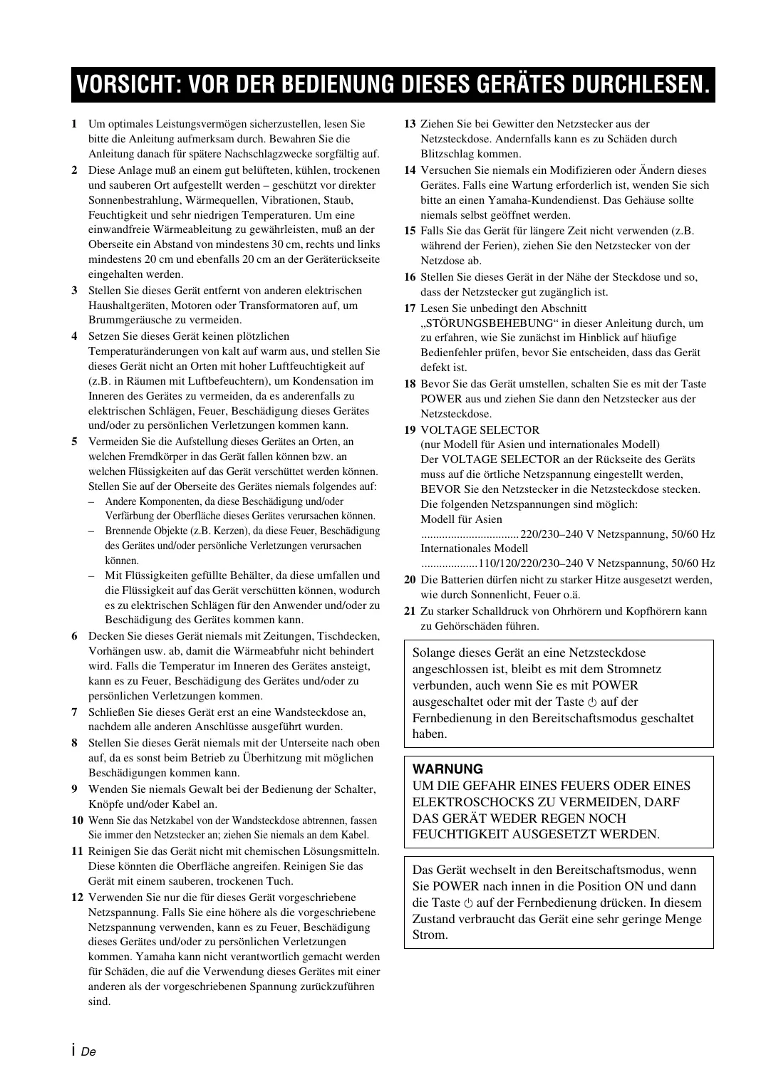 1 Um optimales Leistungsvermögen sicherzustellen, lesen Sie bitte die Anleitung aufmerksam durch. Bewahren Sie die Para evitar daños provocados por relámpagos, desenchufe el cable de alimentación de la toma de la pared o de la unidad durante tormentas eléctricas. No intente modificar ni arreglar este aparato. Póngase en contacto con el personal de servicio Yamaha cualificado cuando necesite realizar alguna reparación. La caja no deberá abrirse nunca por ninguna razón.
