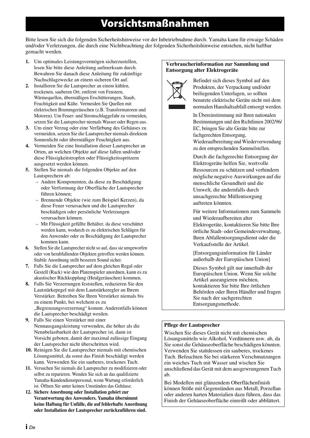 2. Installez les enceintes dans un endroit frais, sec, loin des fenêtres et des sources de chaleur et de vibration, des poussières, de l’humidité et du froid. Évitez les sources de ronflements électriques (transformateurs et moteurs, par exemple). Pour éviter les risques d’incendie et de secousses électriques, n’exposez pas les enceintes à la pluie ni à l’humidité. 3. Pour éviter que la menuiserie des enceintes ne se déforme ou ne se décolore, n’exposez pas les enceintes à la lumière directe du soleil ni à une humidité excessive. 4. Évitez d’installer les enceintes dans un endroit exposé à la chute d’objets ou encore à l’écoulement ou aux éclaboussures de liquides. 5. Ne posez pas les objets suivants sur le dessus des enceintes: – D’autres appareils qui pourraient endommager ou décolorer la menuiserie des enceintes; – Des objets enflammés (par exemple, des bougies) qui pourraient endommager les enceintes, provoquer une blessure, voire un incendie; – Des récipients contenant des liquides qui pourraient se renverser, endommager les enceintes ou être à l’origine d’une secousse électrique. 6. Ne placez pas les enceintes dans un endroit où elles peuvent être heurtées, directement ou par la chute d’objets. Un emplacement stable garantit l’obtention de meilleures sonorités. 7. Placer les enceintes sur des étagères ou dans un meuble qui contient également la platine de lecture, peut entraîner un phénomène de bouclage. 8. En cas de “saturation” , réduisez le niveau de sortie de l’amplificateur. N’excitez pas l’amplificateur au point qu’il écrête. Dans ce cas en effet, les enceintes pourraient être endommagées. 9. Vous devez être très attentif, si l’amplificateur peut délivrer une puissance supérieure à la puissance maximale admissible par les enceintes, à ce que cela ne se produise pas. 10. Ne nettoyez pas la menuiserie des enceintes avec un produit chimique qui peut endommager leur finition. Utilisez un chiffon sec et propre. 11. Ne tentez pas de modifier les enceintes ni de les réparer. Consultez le service Yamaha compétent si une réparation est nécessaire. Pour quelque raison que ce soit, ne démontez pas la menuiserie des enceintes. 12. La détermination d’un endroit convenable est de votre responsabilité. Yamaha ne saurait être responsable des accidents provoqués par le choix d’un emplacement qui ne conviendrait pas, ni par l’installation incorrecte des enceintes.