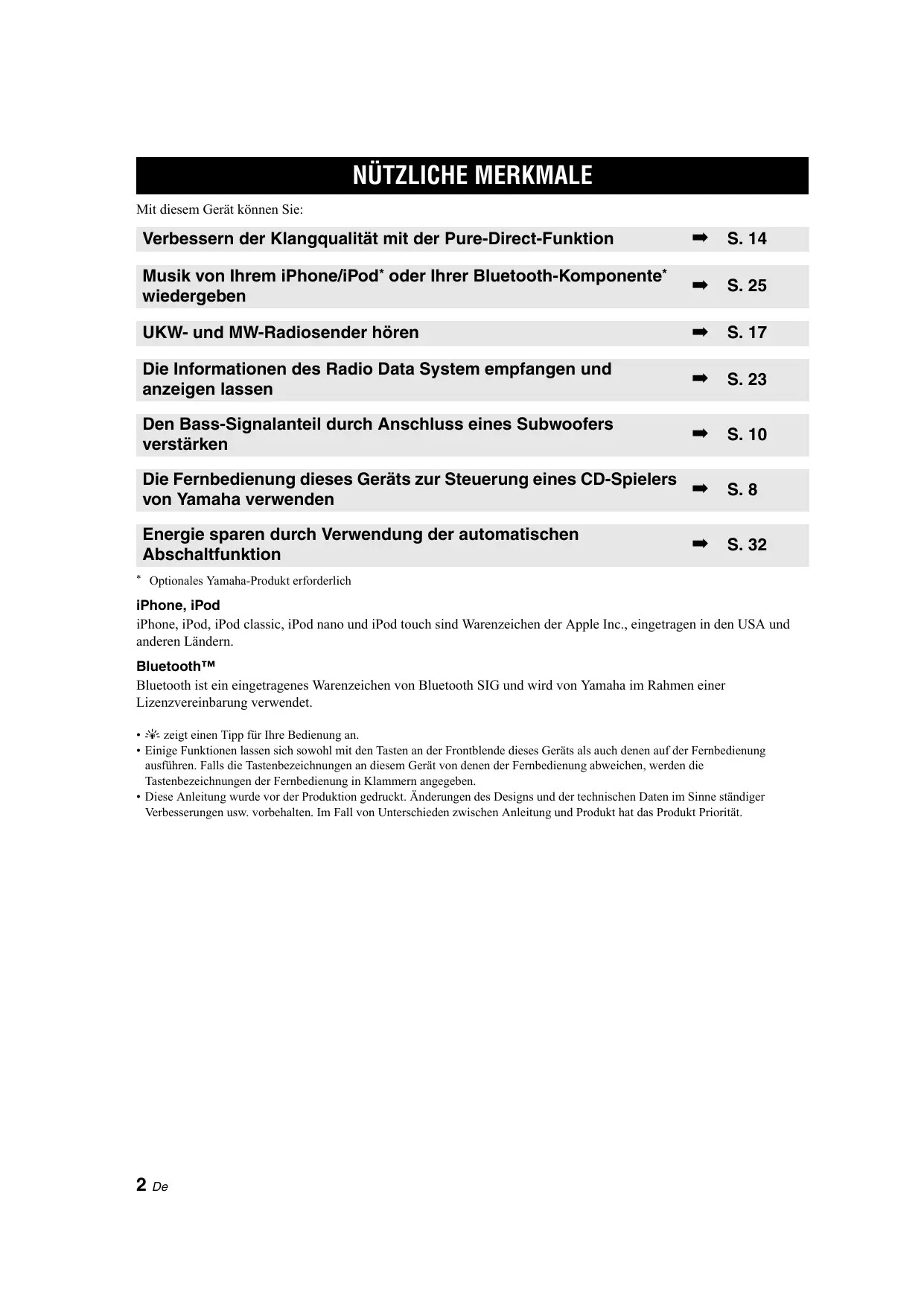iPhone, iPod iPhone, iPod, iPod classic, iPod nano und iPod touch sind Warenzeichen der Apple Inc., eingetragen in den USA und anderen Ländern. Bluetooth™ Bluetooth ist ein eingetragenes Warenzeichen von Bluetooth SIG und wird von Yamaha im Rahmen einer Lizenzvereinbarung verwendet. • y zeigt einen Tipp für Ihre Bedienung an. • Einige Funktionen lassen sich sowohl mit den Tasten an der Frontblende dieses Geräts als auch denen auf der Fernbedienung ausführen. Falls die Tastenbezeichnungen an diesem Gerät von denen der Fernbedienung abweichen, werden die Tastenbezeichnungen der Fernbedienung in Klammern angegeben. • Diese Anleitung wurde vor der Produktion gedruckt. Änderungen des Designs und der technischen Daten im Sinne ständiger Verbesserungen usw. vorbehalten. Im Fall von Unterschieden zwischen Anleitung und Produkt hat das Produkt Priorität.