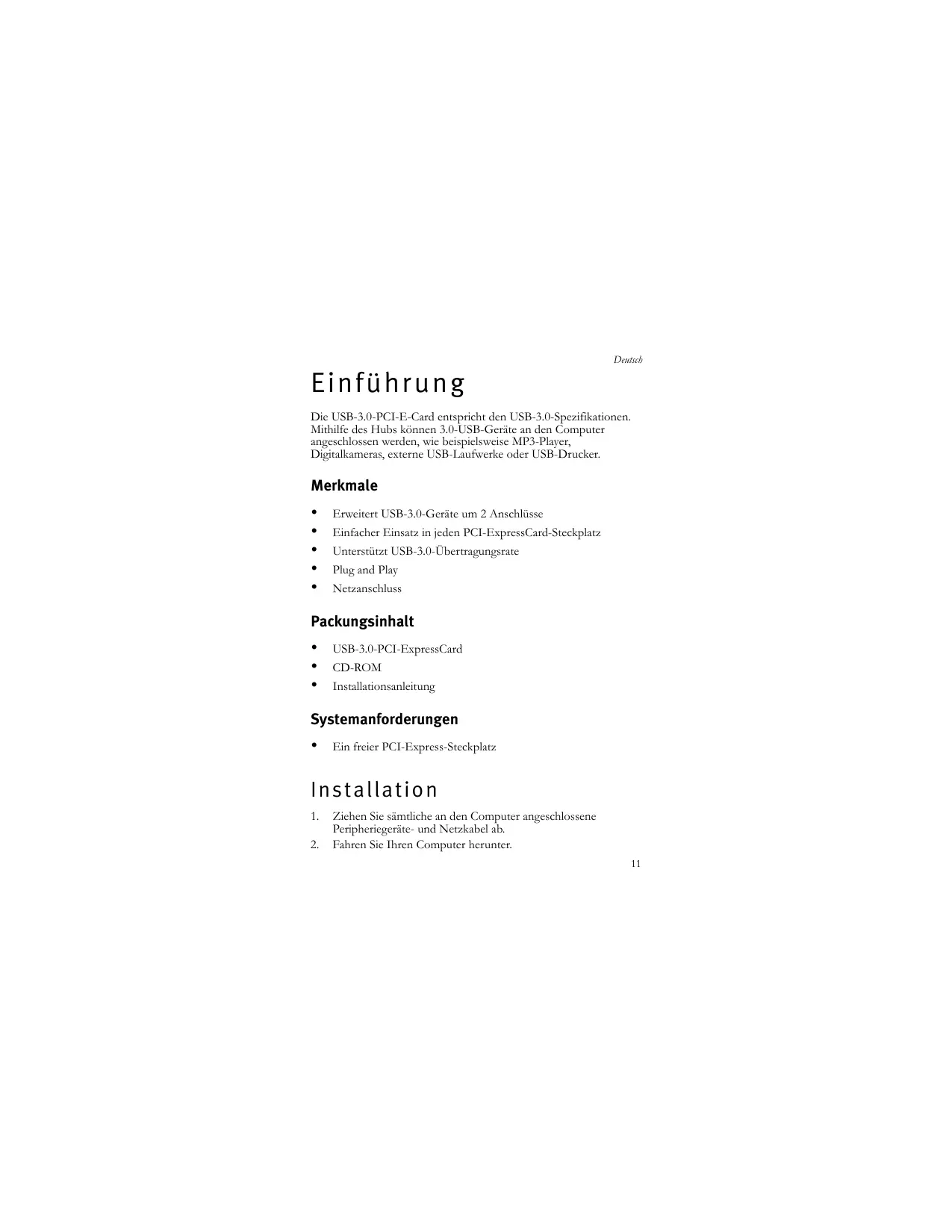 Packungsinhalt y USB-3.0-PCI-ExpressCard y CD-ROM y Installationsanleitung Systemanforderungen y Ein freier PCI-Express-Steckplatz