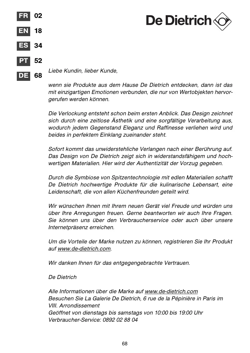 Um die Vorteile der Marke nutzen zu können, registrierten Sie Ihr Produkt auf www.de-dietrich.com.