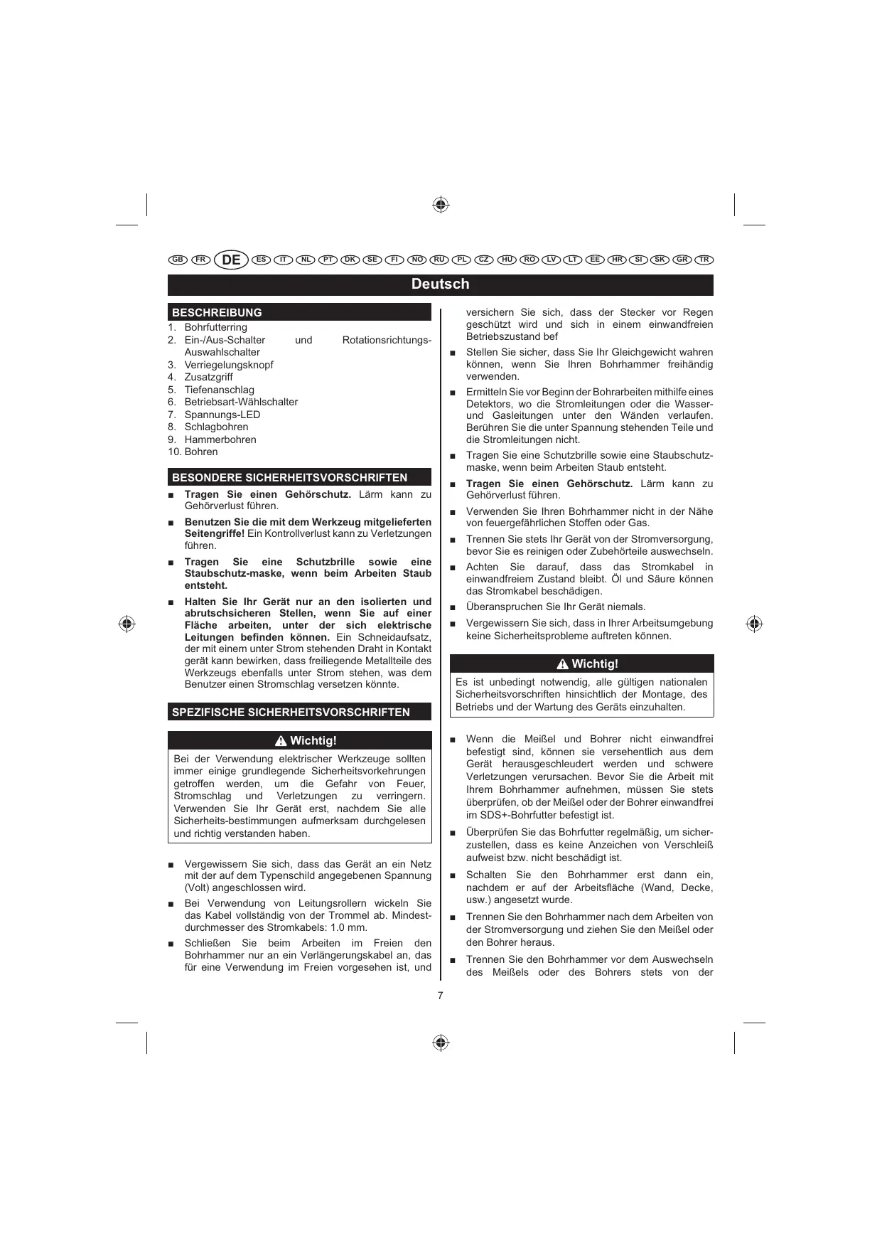 2. Gâchette et sélecteur du sens de rotation 3. Bouton de verrouillage 4. Poignée auxiliaire 5. Butée de Profondeur 6. Sélecteur de mode 7. Témoin de mise sous tension 8. Mode percussion 9. Mode perçage avec burinage 10. Mode perçage Assurez-vous que la tension (en volts) utilisée correspond aux indications figurant sur la plaque signalétique de l'outil.