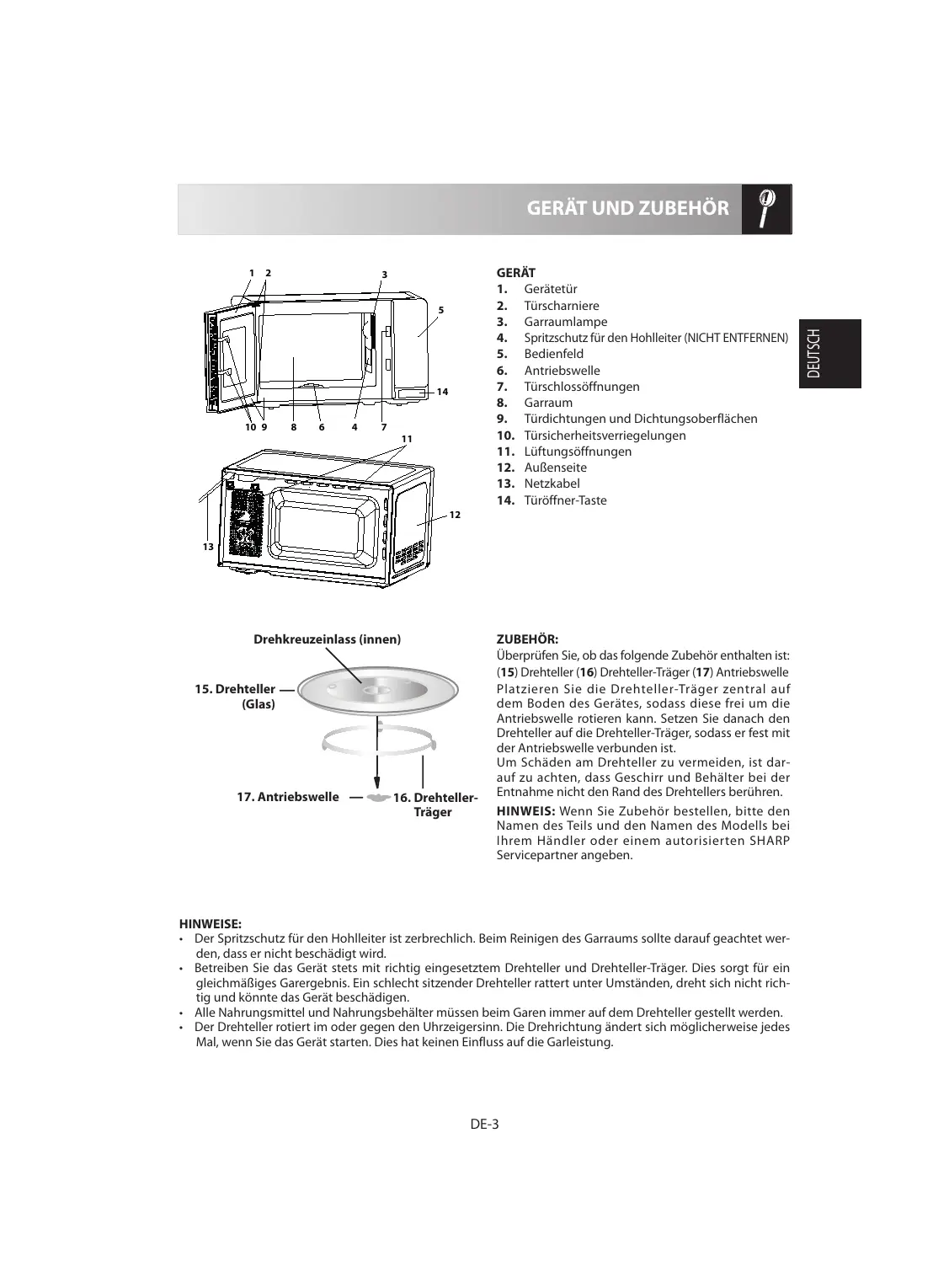 - Alle Nahrungsmittel und Nahrungsbehalter müssen beim Garen immer auf dem Drehteller gestellt werden.