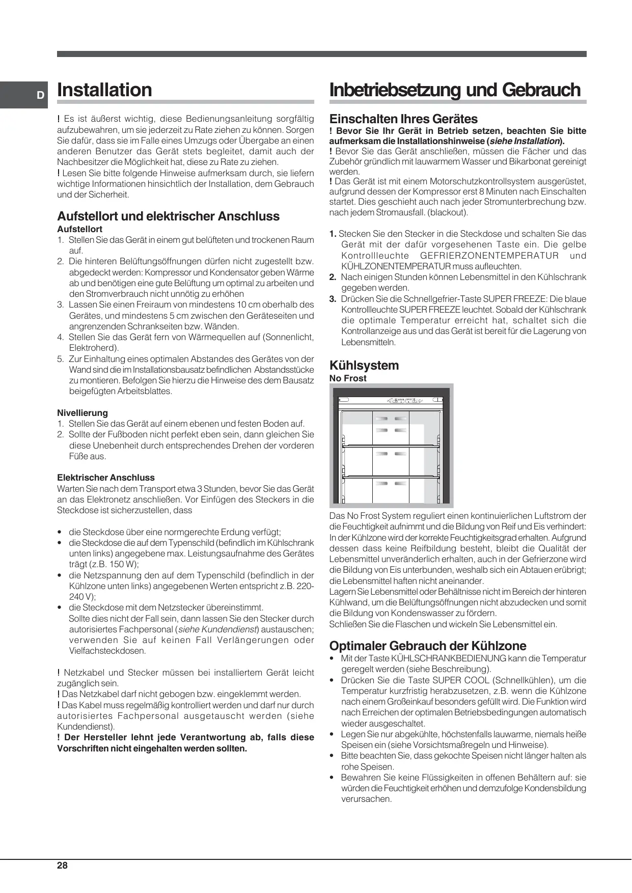 Installation Inbetriebsetzung und Gebrauch ! Es ist äußerst wichtig, diese Bedienungsanleitung sorgfältig aufzubewahren, um sie jederzeit zu Rate ziehen zu können. Sorgen Sie dafür, dass sie im Falle eines Umzugs oder Übergabe an einen anderen Benutzer das Gerät stets begleitet, damit auch der Nachbesitzer die Möglichkeit hat, diese zu Rate zu ziehen. ! Lesen Sie bitte folgende Hinweise aufmerksam durch, sie liefern wichtige Informationen hinsichtlich der Installation, dem Gebrauch und der Sicherheit. Einschalten Ihres Gerätes Aufstellort und elektrischer Anschluss Aufstellort