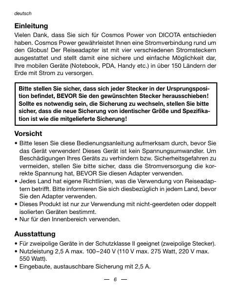 Vielen Dank, dass Sie sich für Cosmos Power von DICOTA entschieden haben. Cosmos Power gewährleistet Ihnen eine Stromverbindung rund um den Globus! Der Reiseadapter ist mit vier verschiedenen Stromsteckern ausgestattet und stellt damit eine sichere und einfache Möglichkeit dar, ihre mobilen Geräte (Notebook, PDA, Handy etc.) in über 150 Ländern der Erde mit Strom zu versorgen.
