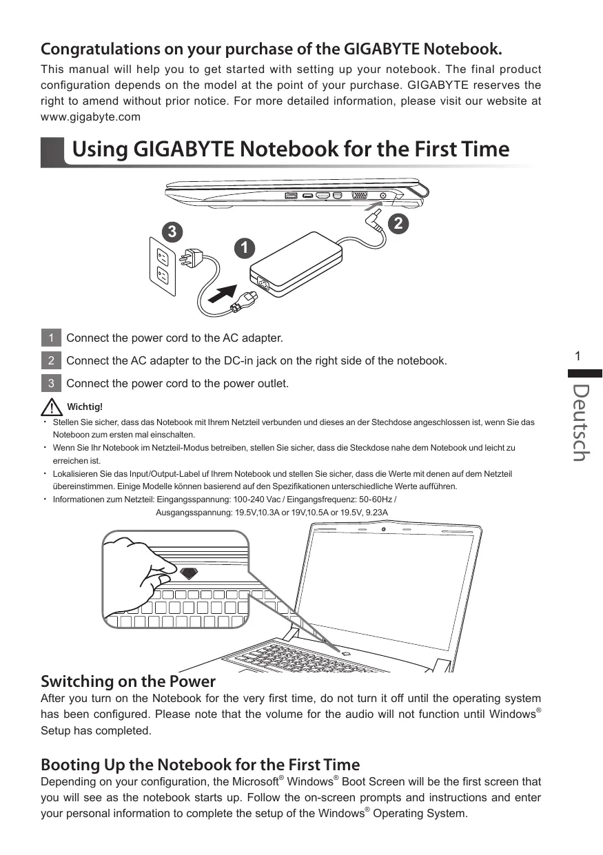 • S tellen Sie sicher, dass das Notebook mit Ihrem Netzteil verbunden und dieses an der Stechdose angeschlossen ist, wenn Sie das Noteboon zum ersten mal einschalten. • Wenn Sie Ihr Notebook im Netzteil-Modus betreiben, stellen Sie sicher, dass die Steckdose nahe dem Notebook und leicht zu erreichen ist. • Lokalisieren Sie das Input/Output-Label uf Ihrem Notebook und stellen Sie sicher, dass die Werte mit denen auf dem Netzteil übereinstimmen. Einige Modelle können basierend auf den Spezifikationen unterschiedliche Werte aufführen. • Informationen zum Netzteil: Eingangsspannung: 100-240 Vac / Eingangsfrequenz: 50-60Hz /