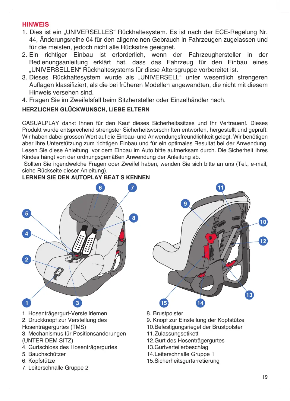 CASUALPLAY dankt Ihnen für den Kauf dieses Sicherheitssitzes und Ihr Vertrauen!. Dieses Produkt wurde entsprechend strengster Sicherheitsvorschriften entworfen, hergestellt und geprüft. Wir haben dabei grossen Wert auf die Einbau- und Anwendungsfreundlichkeit gelegt. Wir benötigen aber Ihre Unterstützung zum richtigen Einbau und für ein optimales Resultat bei der Anwendung. Lesen Sie diese Anleitung vor dem Einbau im Auto bitte aufmerksam durch. Die Sicherheit Ihres Kindes hängt von der ordnungsgemäßen Anwendung der Anleitung ab. Sollten Sie irgendwelche Fragen oder Zweifel haben, wenden Sie sich bitte an uns (Tel., e-mail, siehe Rückseite dieser Anleitung). LERNEN SIE DEN AUTOPLAY BEAT S KENNEN