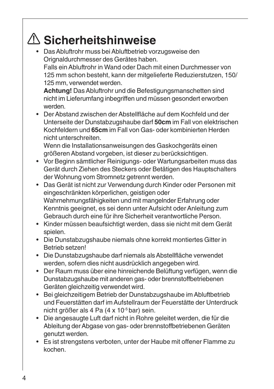 Dans le cas où il existe déjà un tuyau d’évacuation de l’air d’un diamètre de 125 mm dans le mur ou sur le toit, on pourra utiliser le manchon de réduction 150/125 mm. Le bruit de fonctionnement sera un peu plus élevé. Attention ! Le tuyau d’évacuation et les colliers de fixation ne sont pas fournis et doivent être achetés à part. • La distance minimum entre la superficie de support des récipients sur le dispositif de cuisson et la partie la plus basse de la hotte de cuisine ne doit pas être inférieure à 50cm dans le cas de cuisinières électriques et de 65cm dans le cas de cuisinières à gaz ou mixtes. Si les instructions d’installation du dispositif de cuisson au gaz spécifient une plus grande distance, il faut en tenir compte. • Avant toute opération de nettoyage ou d’entretien, débrancher la hotte du circuit électrique en retirant la prise ou en coupant l’interrupteur général de l’habitation. • L’appareil n’est pas destiné à une utilisation par des enfants ou des personnes à capacités physiques, sensorielles ou mentales réduites et sans expérience et connaissance à moins qu’ils ne soient sous la supervision ou formés sur l’utilisation de l’appareil par une personne responsable de leur sécurité. • Les enfants doivent être surveillés afin qu’ils ne jouent pas avec l’appareil. • Ne jamais utiliser la hotte sans que la grille ne soit montée correctement! • La hotte ne doit JAMAIS être utilisée comme plan pour déposer quelque chose sauf si cela est expressément indiqué. • Quand la hotte est utilisée en même temps que d’autres appareils à combustion de gaz ou d’autres combustibles, le local doit disposer d’une ventilation suffisante. • L’air aspiré ne doit jamais être envoyé dans un conduit utilisé pour l’évacuation des fumées produites par des appareils à combustion de gaz ou d’autres combustibles. • Il est formellement interdit de faire flamber les aliments sous la hotte. • L’utilisation de flammes libres peut entraîner des dégâts aux filtres et peut donner lieu à des incendies, il faut donc les éviter à tout prix. 45