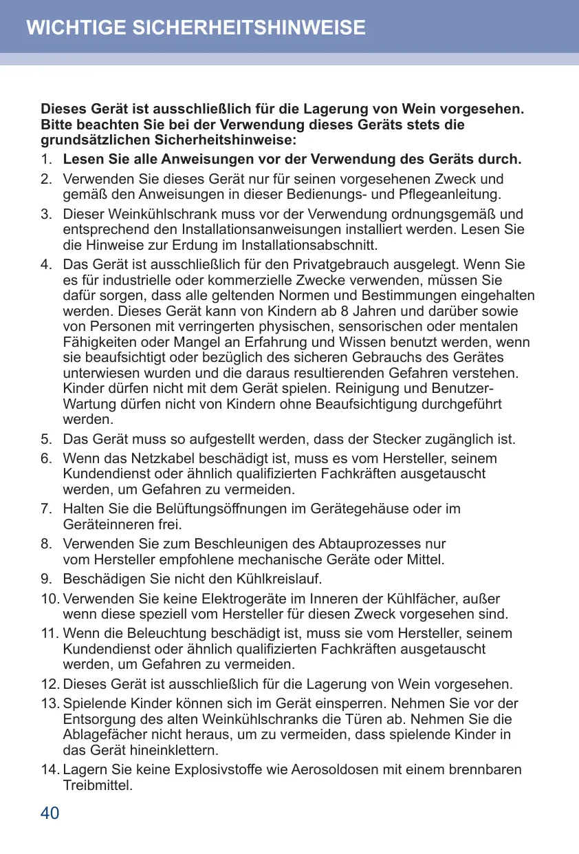 WICHTIGE SICHERHEITSHINWEISE Überschrift 1 Dieses Gerät ist ausschließlich für die Lagerung von Wein vorgesehen. Bitte beachten Sie bei der Verwendung dieses Geräts stets die grundsätzlichen Sicherheitshinweise: 1. Lesen Sie alle Anweisungen vor der Verwendung des Geräts durch. 2. Verwenden Sie dieses Gerät nur für seinen vorgesehenen Zweck und gemäß den Anweisungen in dieser Bedienungs- und Pflegeanleitung. 3. Dieser Weinkühlschrank muss vor der Verwendung ordnungsgemäß und entsprechend den Installationsanweisungen installiert werden. Lesen Sie die Hinweise zur Erdung im Installationsabschnitt. 4. Das Gerät ist ausschließlich für den Privatgebrauch ausgelegt. Wenn Sie es für industrielle oder kommerzielle Zwecke verwenden, müssen Sie dafür sorgen, dass alle geltenden Normen und Bestimmungen eingehalten werden. Dieses Gerät kann von Kindern ab 8 Jahren und darüber sowie von Personen mit verringerten physischen, sensorischen oder mentalen Fähigkeiten oder Mangel an Erfahrung und Wissen benutzt werden, wenn sie beaufsichtigt oder bezüglich des sicheren Gebrauchs des Gerätes unterwiesen wurden und die daraus resultierenden Gefahren verstehen. Kinder dürfen nicht mit dem Gerät spielen. Reinigung und BenutzerWartung dürfen nicht von Kindern ohne Beaufsichtigung durchgeführt werden. 5. Das Gerät muss so aufgestellt werden, dass der Stecker zugänglich ist. 6. Wenn das Netzkabel beschädigt ist, muss es vom Hersteller, seinem Kundendienst oder ähnlich qualifizierten Fachkräften ausgetauscht werden, um Gefahren zu vermeiden. 7. Halten Sie die Belüftungsöffnungen im Gerätegehäuse oder im Geräteinneren frei. 8. Verwenden Sie zum Beschleunigen des Abtauprozesses nur vom Hersteller empfohlene mechanische Geräte oder Mittel. 9. Beschädigen Sie nicht den Kühlkreislauf. 10. Verwenden Sie keine Elektrogeräte im Inneren der Kühlfächer, außer wenn diese speziell vom Hersteller für diesen Zweck vorgesehen sind. 11. Wenn die Beleuchtung beschädigt ist, muss sie vom Hersteller, seinem Kundendienst oder ähnlich qualifizierten Fachkräften ausgetauscht werden, um Gefahren zu vermeiden. 12. Dieses Gerät ist ausschließlich für die Lagerung von Wein vorgesehen. 13. Spielende Kinder können sich im Gerät einsperren. Nehmen Sie vor der Entsorgung des alten Weinkühlschranks die Türen ab. Nehmen Sie die Ablagefächer nicht heraus, um zu vermeiden, dass spielende Kinder in das Gerät hineinklettern. 14. Lagern Sie keine Explosivstoffe wie Aerosoldosen mit einem brennbaren Treibmittel.