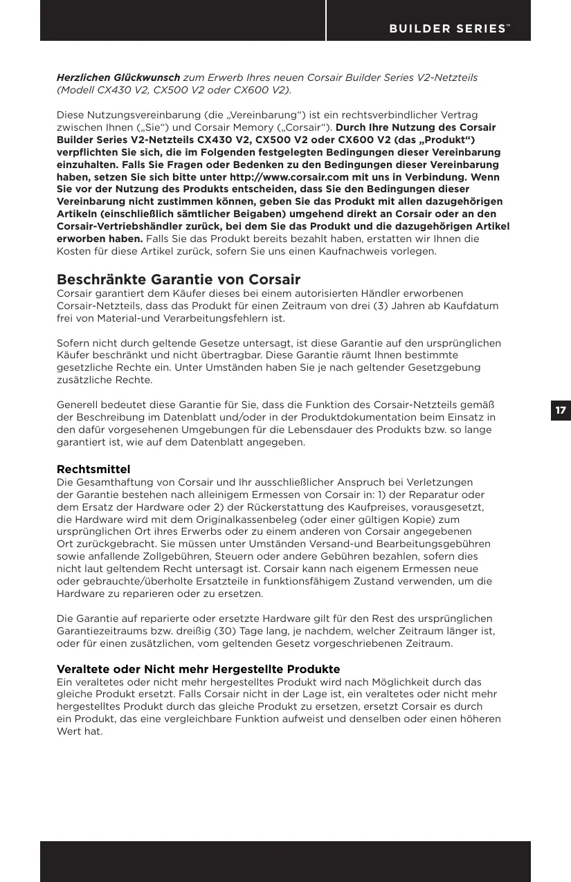 R 51318.22-99 R 51318.24-99 R 51317.3.2-2006 R 51317.3.3-99 2002/95/EC, Restriction of Hazardous Substances Directive (Directive européenne limitant l’utilisation de substances dangereuses) 2002/96/EC, Waste Electrical and Electronic Equipment Directive (Directive européenne relative aux déchets d’équipements électriques et électroniques) Commande No.39 de la Chine, Administration pour le Contrôle de la Pollution causée par les Produits d’Information Électronique B U I L D E R S E R I E S™ Herzlichen Glückwunsch zum Erwerb Ihres neuen Corsair Builder Series V2-Netzteils (Modell CX430 V2, CX500 V2 oder CX600 V2). Diese Nutzungsvereinbarung (die „Vereinbarung“) ist ein rechtsverbindlicher Vertrag zwischen Ihnen („Sie“) und Corsair Memory („Corsair“). Durch Ihre Nutzung des Corsair Builder Series V2-Netzteils CX430 V2, CX500 V2 oder CX600 V2 (das „Produkt“) verpflichten Sie sich, die im Folgenden festgelegten Bedingungen dieser Vereinbarung einzuhalten. Falls Sie Fragen oder Bedenken zu den Bedingungen dieser Vereinbarung haben, setzen Sie sich bitte unter http://www.corsair.com mit uns in Verbindung. Wenn Sie vor der Nutzung des Produkts entscheiden, dass Sie den Bedingungen dieser Vereinbarung nicht zustimmen können, geben Sie das Produkt mit allen dazugehörigen Artikeln (einschließlich sämtlicher Beigaben) umgehend direkt an Corsair oder an den Corsair-Vertriebshändler zurück, bei dem Sie das Produkt und die dazugehörigen Artikel erworben haben. Falls Sie das Produkt bereits bezahlt haben, erstatten wir Ihnen die Kosten für diese Artikel zurück, sofern Sie uns einen Kaufnachweis vorlegen. Beschränkte Garantie von Corsair Corsair garantiert dem Käufer dieses bei einem autorisierten Händler erworbenen Corsair-Netzteils, dass das Produkt für einen Zeitraum von drei (3) Jahren ab Kaufdatum frei von Material-und Verarbeitungsfehlern ist. Sofern nicht durch geltende Gesetze untersagt, ist diese Garantie auf den ursprünglichen Käufer beschränkt und nicht übertragbar. Diese Garantie räumt Ihnen bestimmte gesetzliche Rechte ein. Unter Umständen haben Sie je nach geltender Gesetzgebung zusätzliche Rechte. Generell bedeutet diese Garantie für Sie, dass die Funktion des Corsair-Netzteils gemäß der Beschreibung im Datenblatt und/oder in der Produktdokumentation beim Einsatz in den dafür vorgesehenen Umgebungen für die Lebensdauer des Produkts bzw. so lange garantiert ist, wie auf dem Datenblatt angegeben. Rechtsmittel Die Gesamthaftung von Corsair und Ihr ausschließlicher Anspruch bei Verletzungen der Garantie bestehen nach alleinigem Ermessen von Corsair in: 1) der Reparatur oder dem Ersatz der Hardware oder 2) der Rückerstattung des Kaufpreises, vorausgesetzt, die Hardware wird mit dem Originalkassenbeleg (oder einer gültigen Kopie) zum ursprünglichen Ort ihres Erwerbs oder zu einem anderen von Corsair angegebenen Ort zurückgebracht. Sie müssen unter Umständen Versand-und Bearbeitungsgebühren sowie anfallende Zollgebühren, Steuern oder andere Gebühren bezahlen, sofern dies nicht laut geltendem Recht untersagt ist. Corsair kann nach eigenem Ermessen neue oder gebrauchte/überholte Ersatzteile in funktionsfähigem Zustand verwenden, um die Hardware zu reparieren oder zu ersetzen. Die Garantie auf reparierte oder ersetzte Hardware gilt für den Rest des ursprünglichen Garantiezeitraums bzw. dreißig (30) Tage lang, je nachdem, welcher Zeitraum länger ist, oder für einen zusätzlichen, vom geltenden Gesetz vorgeschriebenen Zeitraum. Veraltete oder Nicht mehr Hergestellte Produkte Ein veraltetes oder nicht mehr hergestelltes Produkt wird nach Möglichkeit durch das gleiche Produkt ersetzt. Falls Corsair nicht in der Lage ist, ein veraltetes oder nicht mehr hergestelltes Produkt durch das gleiche Produkt zu ersetzen, ersetzt Corsair es durch ein Produkt, das eine vergleichbare Funktion aufweist und denselben oder einen höheren Wert hat.