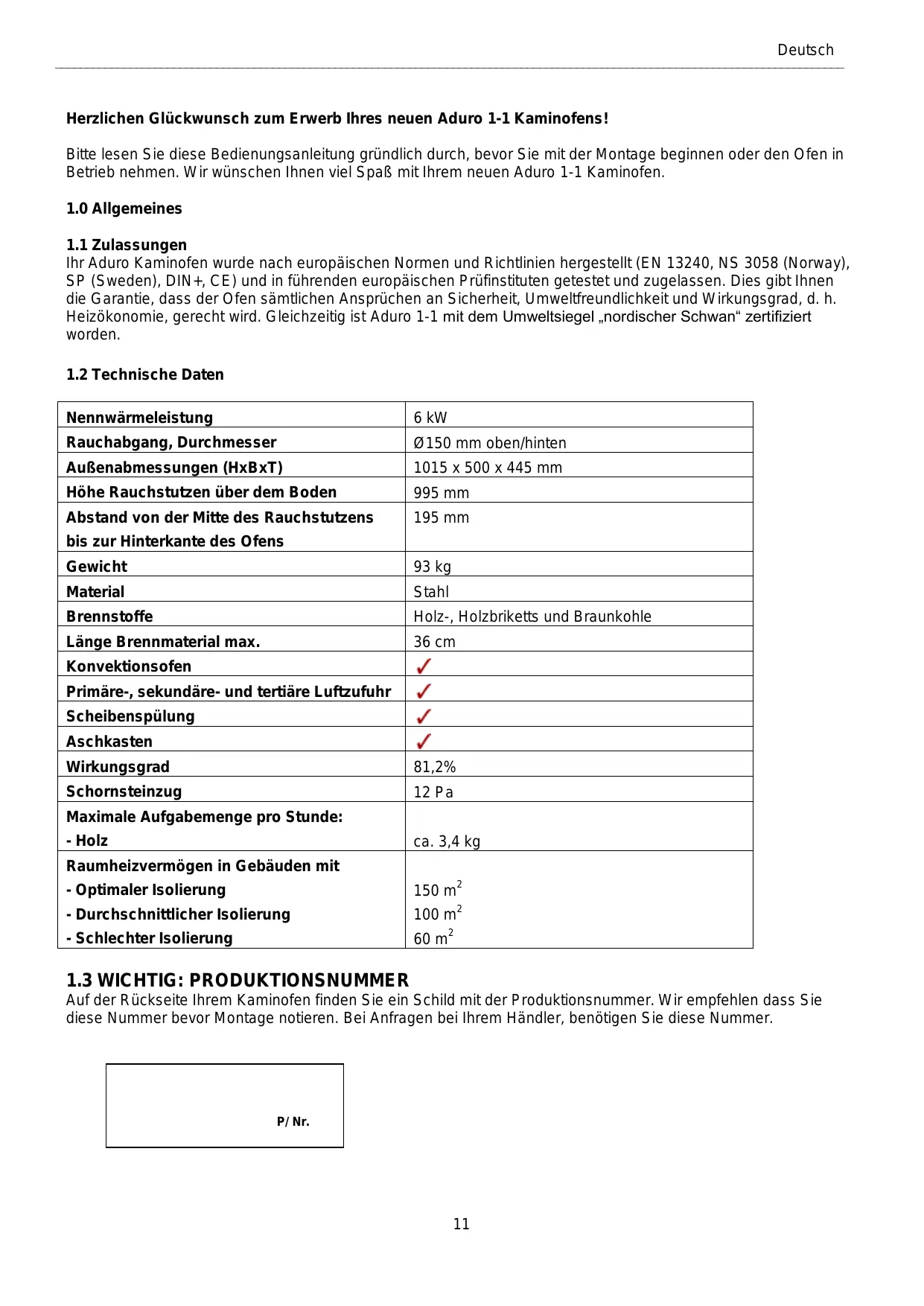 Auf der Rückseite Ihrem Kaminofen finden Sie ein Schild mit der Produktionsnummer. Wir empfehlen dass Sie diese Nummer bevor Montage notieren. Bei Anfragen bei Ihrem Händler, benötigen Sie diese Nummer. P/ Nr.