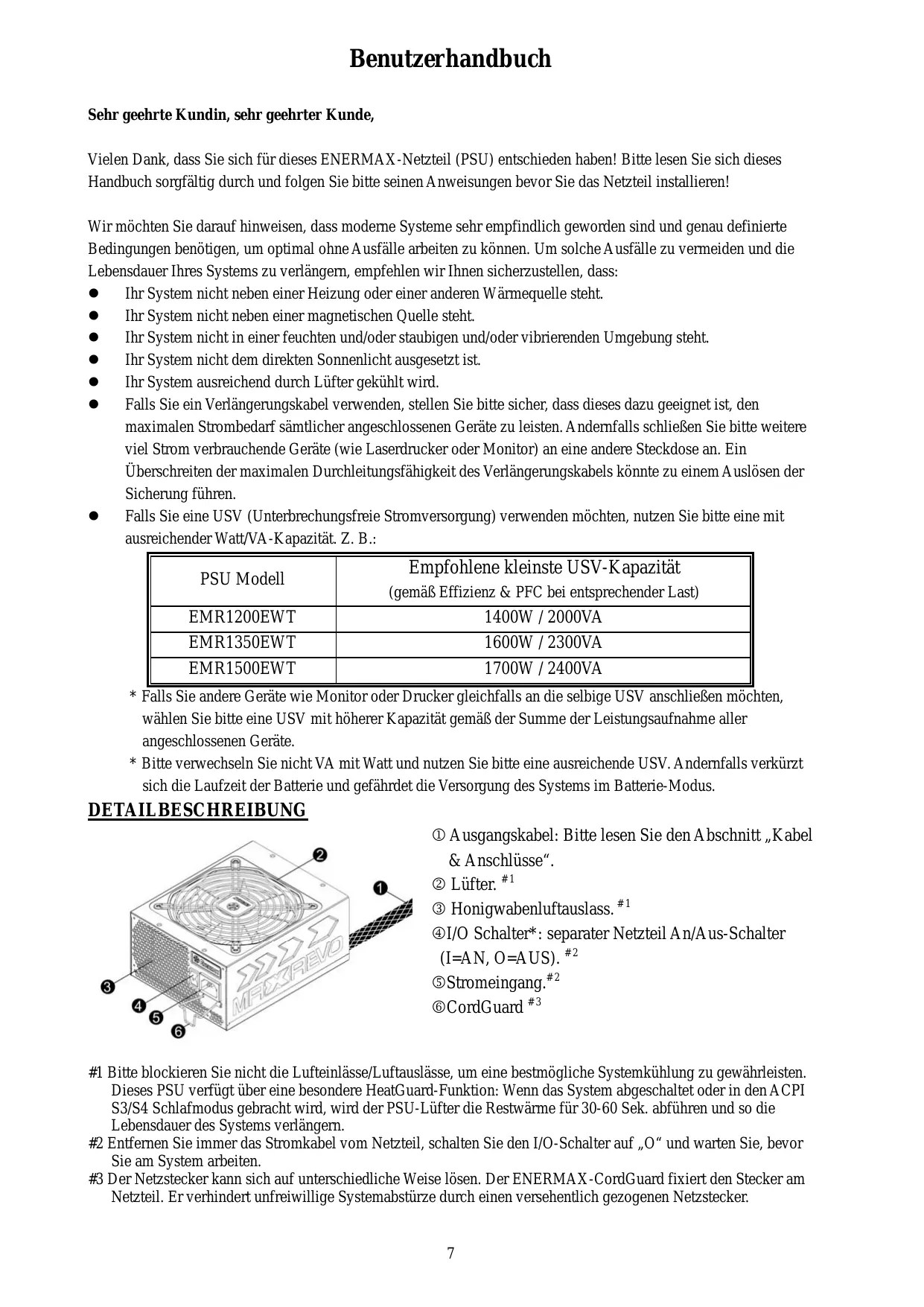 Benutzerhandbuch Sehr geehrte Kundin, sehr geehrter Kunde, Vielen Dank, dass Sie sich für dieses ENERMAX-Netzteil (PSU) entschieden haben! Bitte lesen Sie sich dieses Handbuch sorgfältig durch und folgen Sie bitte seinen Anweisungen bevor Sie das Netzteil installieren! Wir möchten Sie darauf hinweisen, dass moderne Systeme sehr empfindlich geworden sind und genau definierte Bedingungen benötigen, um optimal ohne Ausfälle arbeiten zu können. Um solche Ausfälle zu vermeiden und die Lebensdauer Ihres Systems zu verlängern, empfehlen wir Ihnen sicherzustellen, dass: Ihr System nicht neben einer Heizung oder einer anderen Wärmequelle steht. Ihr System nicht neben einer magnetischen Quelle steht. Ihr System nicht in einer feuchten und/oder staubigen und/oder vibrierenden Umgebung steht. Ihr System nicht dem direkten Sonnenlicht ausgesetzt ist. Ihr System ausreichend durch Lüfter gekühlt wird. Falls Sie ein Verlängerungskabel verwenden, stellen Sie bitte sicher, dass dieses dazu geeignet ist, den maximalen Strombedarf sämtlicher angeschlossenen Geräte zu leisten. Andernfalls schließen Sie bitte weitere viel Strom verbrauchende Geräte (wie Laserdrucker oder Monitor) an eine andere Steckdose an. Ein Überschreiten der maximalen Durchleitungsfähigkeit des Verlängerungskabels könnte zu einem Auslösen der Sicherung führen. Falls Sie eine USV (Unterbrechungsfreie Stromversorgung) verwenden möchten, nutzen Sie bitte eine mit ausreichender Watt/VA-Kapazität. Z. B.:
