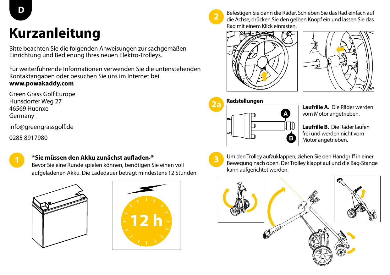 Kurzanleitung Befestigen Sie dann die Räder. Schieben Sie das Rad einfach auf die Achse, drücken Sie den gelben Knopf ein und lassen Sie das Rad mit einem Klick einrasten. Bitte beachten Sie die folgenden Anweisungen zur sachgemäßen Einrichtung und Bedienung Ihres neuen Elektro-Trolleys. Für weiterführende Informationen verwenden Sie die untenstehenden Kontaktangaben oder besuchen Sie uns im Internet bei www.powakaddy.com Green Grass Golf Europe Hunsdorfer Weg 27 46569 Huenxe Germany