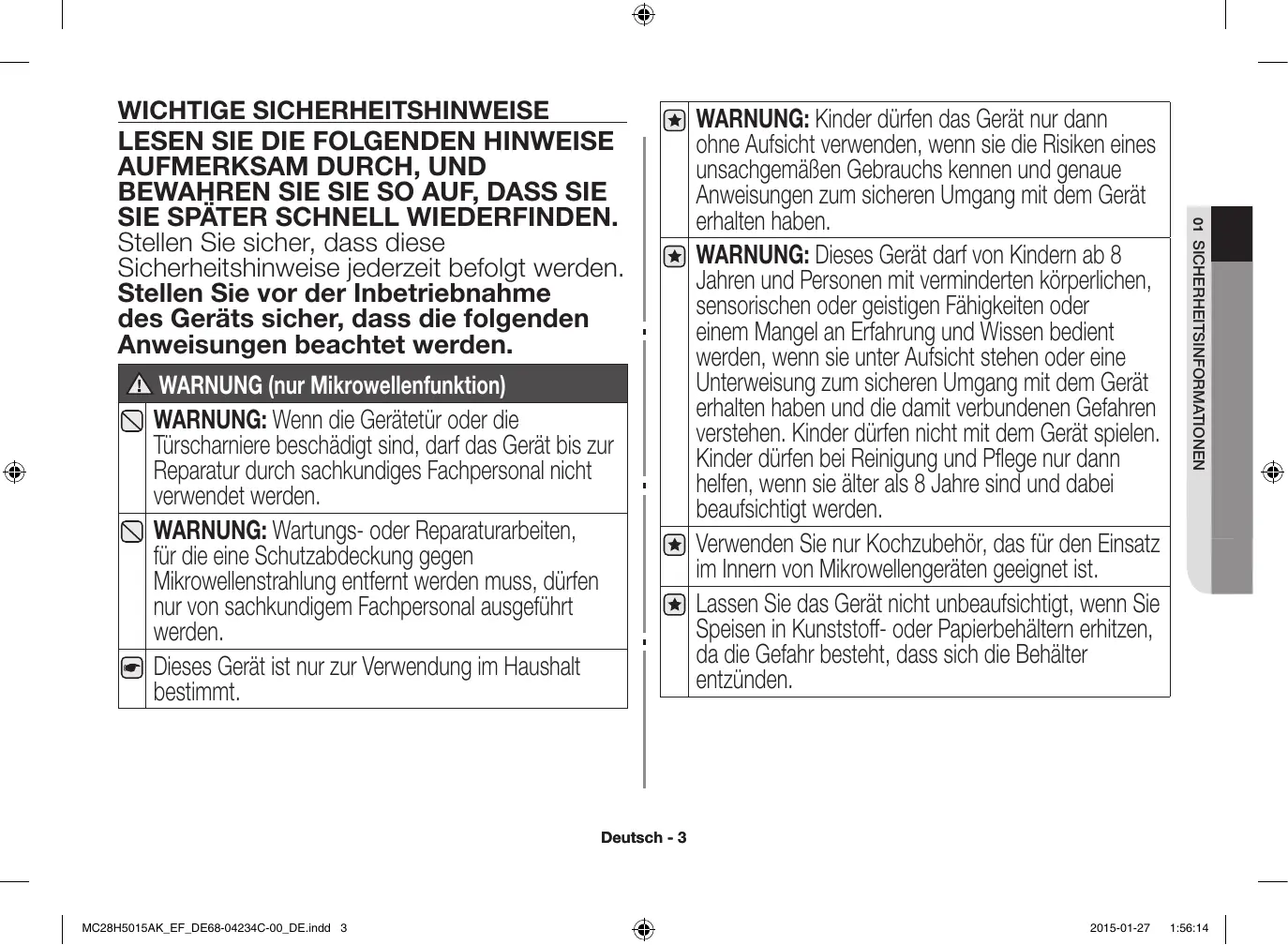 WARNUNG Gefahren oder unsichere Verhaltensweisen, die zu schweren Verletzungen oder zum Tod führen können. VORSICHT Gefahren oder unsichere Verhaltensweisen, die zu leichten Verletzungen oder Sachschäden führen können. Warnung; Brandgefahr Warnung; Heiße Oberfläche Warnung; Strom Warnung; Explosives Material NICHT ausführen. NICHT berühren. NICHT demontieren. Befolgen Sie die Anweisungen genau. Ziehen Sie den Netzstecker aus der Steckdose. Um einen Stromschlag zu vermeiden, stellen Sie sicher, dass das Gerät geerdet ist. Bitten Sie den Kundendienst um Hilfe. Hinweis Wichtig Deutsch - 2 MC28H5015AK_EF_DE68-04234C-00_DE.indd 2 2015-01-27 1:56:14 WARNUNG (nur Mikrowellenfunktion) WARNUNG: Wenn die Gerätetür oder die Türscharniere beschädigt sind, darf das Gerät bis zur Reparatur durch sachkundiges Fachpersonal nicht verwendet werden. WARNUNG: Wartungs- oder Reparaturarbeiten, für die eine Schutzabdeckung gegen Mikrowellenstrahlung entfernt werden muss, dürfen nur von sachkundigem Fachpersonal ausgeführt werden. Dieses Gerät ist nur zur Verwendung im Haushalt bestimmt. WARNUNG: Kinder dürfen das Gerät nur dann ohne Aufsicht verwenden, wenn sie die Risiken eines unsachgemäßen Gebrauchs kennen und genaue Anweisungen zum sicheren Umgang mit dem Gerät erhalten haben. WARNUNG: Dieses Gerät darf von Kindern ab 8 Jahren und Personen mit verminderten körperlichen, sensorischen oder geistigen Fähigkeiten oder einem Mangel an Erfahrung und Wissen bedient werden, wenn sie unter Aufsicht stehen oder eine Unterweisung zum sicheren Umgang mit dem Gerät erhalten haben und die damit verbundenen Gefahren verstehen. Kinder dürfen nicht mit dem Gerät spielen. Kinder dürfen bei Reinigung und Pflege nur dann helfen, wenn sie älter als 8 Jahre sind und dabei beaufsichtigt werden. Verwenden Sie nur Kochzubehör, das für den Einsatz im Innern von Mikrowellengeräten geeignet ist. Lassen Sie das Gerät nicht unbeaufsichtigt, wenn Sie Speisen in Kunststoff- oder Papierbehältern erhitzen, da die Gefahr besteht, dass sich die Behälter entzünden. 01 SICHERHEITSINFORMATIONEN WICHTIGE SICHERHEITSHINWEISE