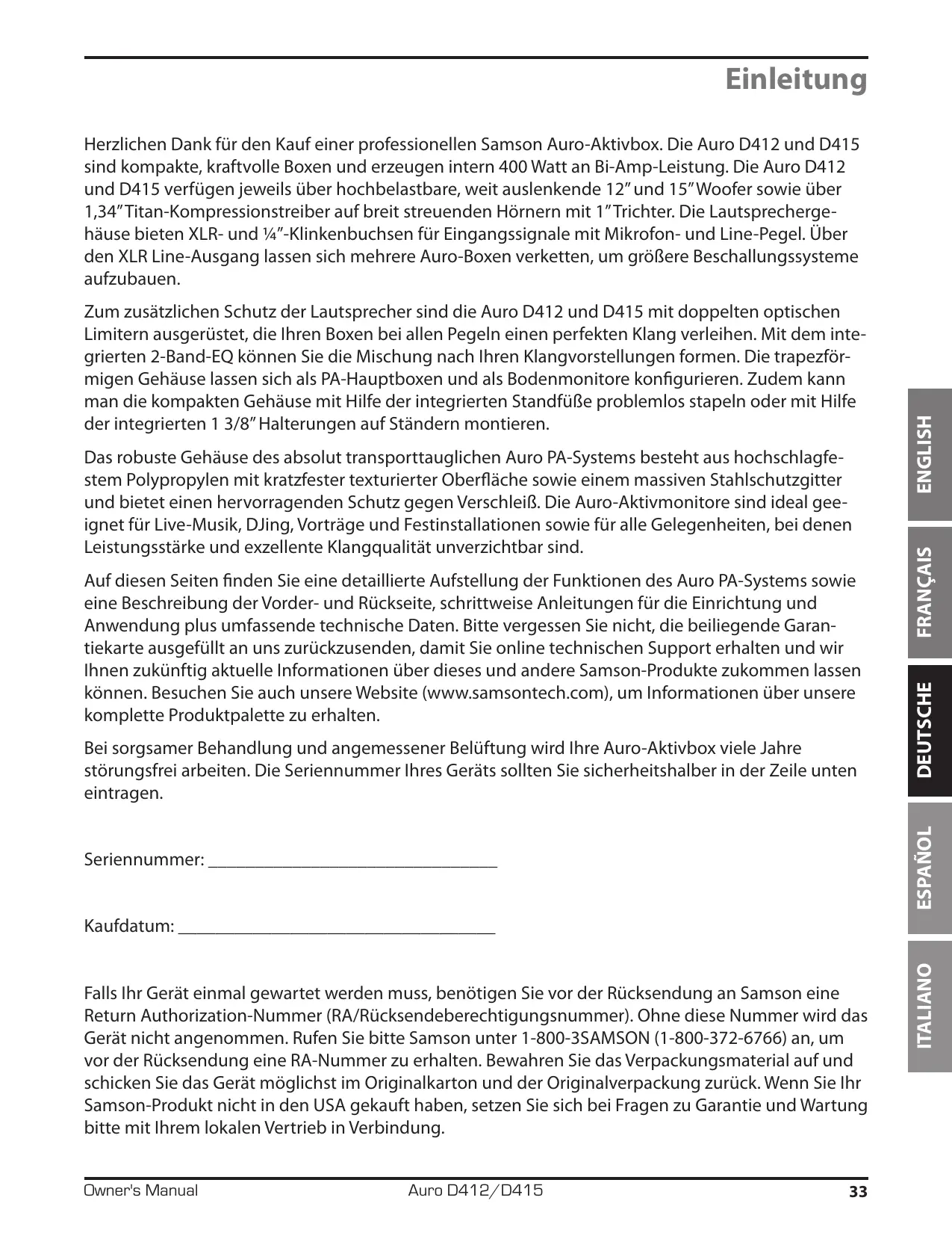 Auf diesen Seiten finden Sie eine detaillierte Aufstellung der Funktionen des Auro PA-Systems sowie eine Beschreibung der Vorder- und Rückseite, schrittweise Anleitungen für die Einrichtung und Anwendung plus umfassende technische Daten.itte vergessen Sie nicht, die beiliegende Garantiekarte ausgefüllt an uns zurückzusenden, damit Sie online technischen Support erhalten und wir Ihnen zukünftig aktuelle Informationen über theses und andere Samson-Produkte sukommen halten können. Besuchen Sie auch unsere Website (www.samsontech.com), um Informationen über unsere komplette Produktpalette zu erhalten.