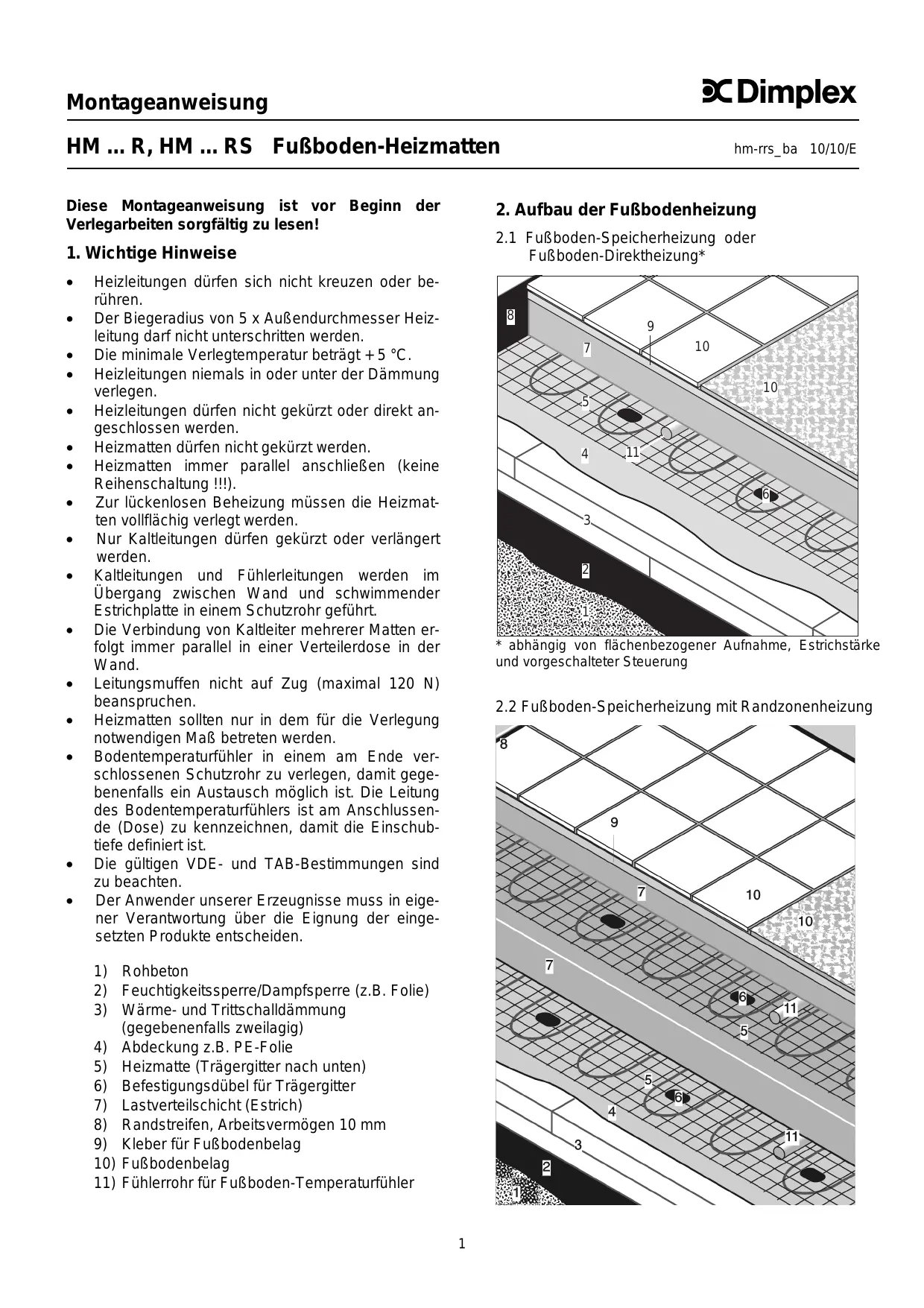 Montageanweisung HM ... R, HM ... RS Fußboden-Heizmatten Diese Montageanweisung ist vor Beginn der Verlegarbeiten sorgfältig zu lesen!