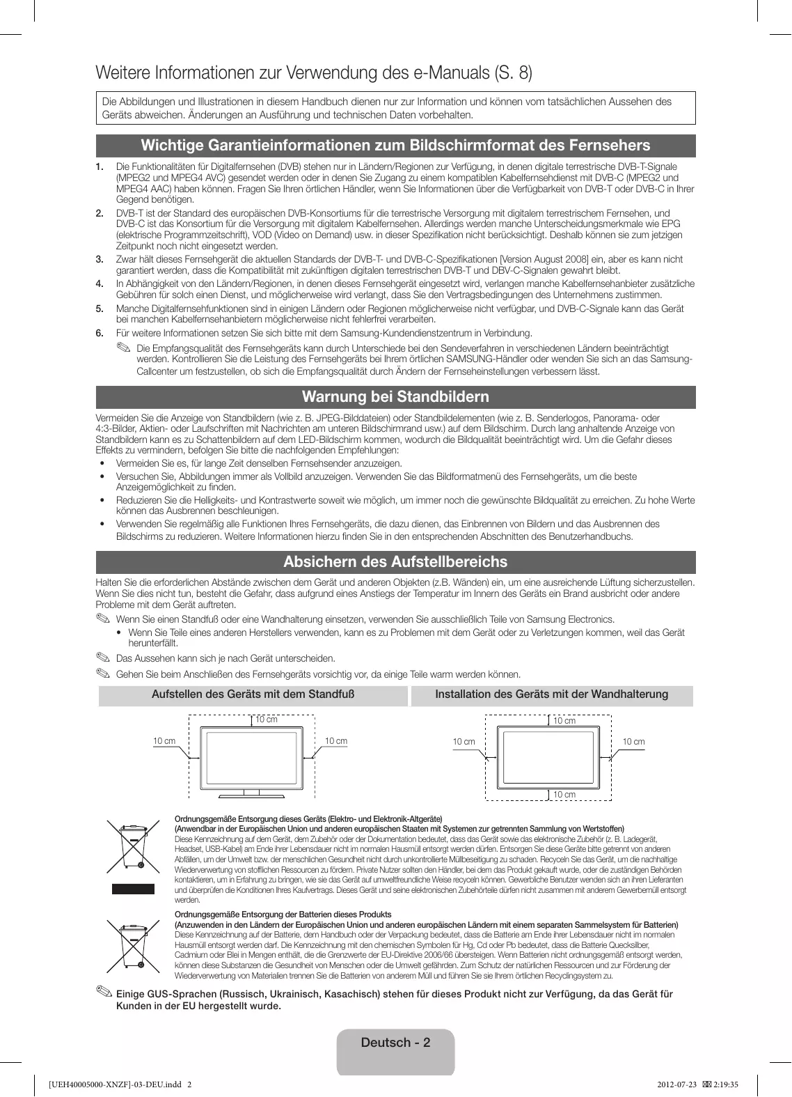 Die Funktionalitäten für Digitalfernsehen (DVB) stehen nur in Ländern/Regionen zur Verfügung, in denen digitale terrestrische DVB-T-Signale (MPEG2 und MPEG4 AVC) gesendet werden oder in denen Sie Zugang zu einem kompatiblen Kabelfernsehdienst mit DVB-C (MPEG2 und MPEG4 AAC) haben können. Fragen Sie Ihren örtlichen Händler, wenn Sie Informationen über die Verfügbarkeit von DVB-T oder DVB-C in Ihrer Gegend benötigen. DVB-T ist der Standard des europäischen DVB-Konsortiums für die terrestrische Versorgung mit digitalem terrestrischem Fernsehen, und DVB-C ist das Konsortium für die Versorgung mit digitalem Kabelfernsehen. Allerdings werden manche Unterscheidungsmerkmale wie EPG (elektrische Programmzeitschrift), VOD (Video on Demand) usw. in dieser Spezifikation nicht berücksichtigt. Deshalb können sie zum jetzigen Zeitpunkt noch nicht eingesetzt werden. Zwar hält dieses Fernsehgerät die aktuellen Standards der DVB-T- und DVB-C-Spezifikationen [Version August 2008] ein, aber es kann nicht garantiert werden, dass die Kompatibilität mit zukünftigen digitalen terrestrischen DVB-T und DBV-C-Signalen gewahrt bleibt. In Abhängigkeit von den Ländern/Regionen, in denen dieses Fernsehgerät eingesetzt wird, verlangen manche Kabelfernsehanbieter zusätzliche Gebühren für solch einen Dienst, und möglicherweise wird verlangt, dass Sie den Vertragsbedingungen des Unternehmens zustimmen. Manche Digitalfernsehfunktionen sind in einigen Ländern oder Regionen möglicherweise nicht verfügbar, und DVB-C-Signale kann das Gerät bei manchen Kabelfernsehanbietern möglicherweise nicht fehlerfrei verarbeiten. Für weitere Informationen setzen Sie sich bitte mit dem Samsung-Kundendienstzentrum in Verbindung. ✎✎ Die Empfangsqualität des Fernsehgeräts kann durch Unterschiede bei den Sendeverfahren in verschiedenen Ländern beeinträchtigt werden. Kontrollieren Sie die Leistung des Fernsehgeräts bei Ihrem örtlichen SAMSUNG-Händler oder wenden Sie sich an das SamsungCallcenter um festzustellen, ob sich die Empfangsqualität durch Ändern der Fernseheinstellungen verbessern lässt. Warnung bei Standbildern Vermeiden Sie die Anzeige von Standbildern (wie z. B. JPEG-Bilddateien) oder Standbildelementen (wie z. B. Senderlogos, Panorama- oder 4:3-Bilder, Aktien- oder Laufschriften mit Nachrichten am unteren Bildschirmrand usw.) auf dem Bildschirm. Durch lang anhaltende Anzeige von Standbildern kann es zu Schattenbildern auf dem LED-Bildschirm kommen, wodurch die Bildqualität beeinträchtigt wird. Um die Gefahr dieses Effekts zu vermindern, befolgen Sie bitte die nachfolgenden Empfehlungen: