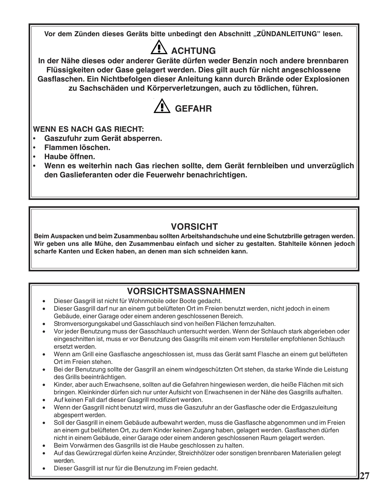 * Ce gril ne devra être modifié en aucun cas. * Lorsque le gril doit être entreposé à l’intérieur, la bonbonne de gaz doit être débranchée du gril et entreposée à l’extérieur dans un endroit bien aéré, hors de la portée des enfants. Les bonbonnes de gaz ne doivent en aucun temps être entreposées à l’intérieur d’un bâtiment, d’un garage ou de tout autre endroit fermé. * Le couvercle doit être fermé lors de la période de préchauffage du gril. * N’utilisez pas le plateau à condiments pour entreposer des briquets, des allumettes ou autres matériaux inflammables. * Ce gril à gaz est conçu pour un usage extérieur seulement.
