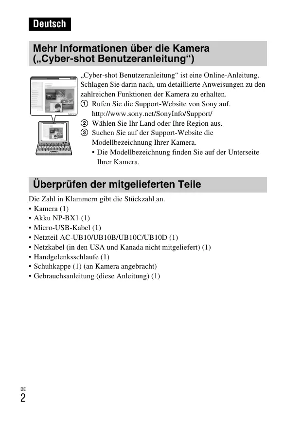 Deutsch Mehr Informationen über die Kamera („Cyber-shot Benutzeranleitung“) „Cyber-shot Benutzeranleitung“ ist eine Online-Anleitung. Schlagen Sie darin nach, um detaillierte Anweisungen zu den zahlreichen Funktionen der Kamera zu erhalten. 1 Rufen Sie die Support-Website von Sony auf. http://www.sony.net/SonyInfo/Support/ 2 Wählen Sie Ihr Land oder Ihre Region aus. 3 Suchen Sie auf der Support-Website die Modellbezeichnung Ihrer Kamera.