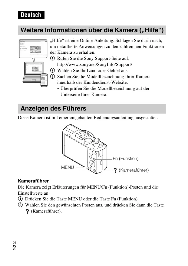 • Überprüfen Sie die Modellbezeichnung auf der Unterseite Ihrer Kamera. Anzeigen des Führers Diese Kamera ist mit einer eingebauten Bedienungsanleitung ausgestattet. Fn (Funktion) MENU (Kameraführer) Kameraführer Die Kamera zeigt Erläuterungen für MENU/Fn (Funktion)-Posten und die Einstellwerte an. 1 Drücken Sie die Taste MENU oder die Taste Fn (Funktion). 2 Wählen Sie den gewünschten Posten aus, und drücken Sie dann die Taste (Kameraführer).