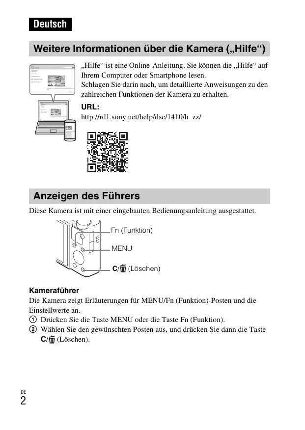 Deutsch Weitere Informationen über die Kamera („Hilfe“) „Hilfe“ ist eine Online-Anleitung. Sie können die „Hilfe“ auf Ihrem Computer oder Smartphone lesen. Schlagen Sie darin nach, um detaillierte Anweisungen zu den zahlreichen Funktionen der Kamera zu erhalten. URL: http://rd1.sony.net/help/dsc/1410/h_zz/ Anzeigen des Führers Diese Kamera ist mit einer eingebauten Bedienungsanleitung ausgestattet. Fn (Funktion) MENU