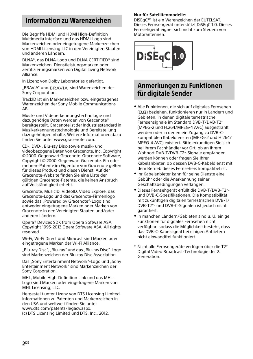 De afbeeldingen en illustraties die gebruikt worden in de Handleiding Snel aan de slag, in de Referentiehandleiding en in Veiligheidsinformatie gelden uitsluitend als referentie en kunnen verschillen van het eigenlijke product. De "x" die wordt weergegeven in de modelnaam komt overeen met een cijfer dat betrekking heeft op het ontwerp, de kleur of het tv systeem. Verwijder de namaakkaart uit de TV CAM (Conditional Access Module)-sleuf alleen om een smartcard in de CAM te plaatsen. De beschikbaarheid van optionele accessoires is afhankelijk van uw land/regio/tv-model/ voorraad. Ontwerp en specificaties kunnen zonder voorafgaande kennisgeving worden gewijzigd. 6NL Information zu Warenzeichen Die Begriffe HDMI und HDMI High-Definition Multimedia Interface und das HDMI-Logo sind Markenzeichen oder eingetragene Markenzeichen von HDMI Licensing LLC in den Vereinigten Staaten und anderen Ländern. Nur für Satellitenmodelle: DiSEqC™ ist ein Warenzeichen der EUTELSAT. Dieses Fernsehgerät unterstützt DiSEqC 1.0. Dieses Fernsehgerät eignet sich nicht zum Steuern von Motorantennen. DLNA®, das DLNA-Logo und DLNA CERTIFIED® sind Markenzeichen, Dienstleistungsmarken oder Zertifizierungsmarken von Digital Living Network Alliance. In Lizenz von Dolby Laboratories gefertigt. „BRAVIA“ und Sony Corporation. sind Warenzeichen der TrackID ist ein Markenzeichen bzw. eingetragenes Warenzeichen der Sony Mobile Communications AB. Musik- und Videoerkennungstechnologie und dazugehörige Daten werden von Gracenote® bereitgestellt. Gracenote ist der Industriestandard in Musikerkennungstechnologie und Bereitstellung dazugehöriger Inhalte. Weitere Informationen dazu finden Sie unter www.gracenote.com. CD-, DVD-, Blu-ray Disc-sowie musik- und videobezogene Daten von Gracenote, Inc. Copyright © 2000-Gegenwart Gracenote. Gracenote Software, Copyright © 2000-Gegenwart Gracenote. Ein oder mehrere Patente im Eigentum von Gracenote gelten für dieses Produkt und diesen Dienst. Auf der Gracenote-Website finden Sie eine Liste der gültigen Gracenote-Patente, die keinen Anspruch auf Vollständigkeit erhebt. Gracenote, MusicID, VideoID, Video Explore, das Gracenote-Logo und das Gracenote-Firmenlogo sowie das „Powered by Gracenote“-Logo sind entweder eingetragene Marken oder Marken von Gracenote in den Vereinigten Staaten und/oder anderen Ländern. Opera® Devices SDK from Opera Software ASA. Copyright 1995-2013 Opera Software ASA. All rights reserved. Wi-Fi, Wi-Fi Direct und Miracast sind Marken oder eingetragene Marken der Wi-Fi Alliance. „Blu-ray Disc“, „Blu-ray“ und das „Blu-ray Disc“-Logo sind Markenzeichen der Blu-ray Disc Association. Das „Sony Entertainment Network“-Logo und „Sony Entertainment Network“ sind Markenzeichen der Sony Corporation. MHL, Mobile High-Definition Link und das MHLLogo sind Marken oder eingetragene Marken von MHL Licensing, LLC. Hergestellt unter Lizenz von DTS Licensing Limited. Informationen zu Patenten und Markenzeichen in den USA und weltweit finden Sie unter www.dts.com/patents/legacy.aspx. (c) DTS Licensing Limited und DTS, Inc., 2012. 2DE Anmerkungen zu Funktionen für digitale Sender Alle Funktionen, die sich auf digitales Fernsehen ) beziehen, funktionieren nur in Ländern und Gebieten, in denen digitale terrestrische Fernsehsignale im Standard DVB-T/DVB-T2* (MPEG-2 und H.264/MPEG-4 AVC) ausgestrahlt werden oder in denen ein Zugang zu DVB-Ckompatiblen Kabeldiensten (MPEG-2 und H.264/ MPEG-4 AVC) existiert. Bitte erkundigen Sie sich bei Ihrem Fachhändler vor Ort, ob an Ihrem Wohnort DVB-T/DVB-T2*-Signale empfangen werden können oder fragen Sie Ihren Kabelanbieter, ob dessen DVB-C-Kabeldienst mit dem Betrieb dieses Fernsehers kompatibel ist. Ihr Kabelanbieter kann für seine Dienste eine Gebühr oder die Anerkennung seiner Geschäftsbedingungen verlangen. Dieses Fernsehgerät erfüllt die DVB-T/DVB-T2*und DVB-C-Spezifikationen. Die Kompatibilität mit zukünftigen digitalen terrestrischen DVB-T/ DVB-T2*- und DVB-C-Signalen ist jedoch nicht garantiert. In manchen Ländern/Gebieten sind u. U. einige Funktionen für digitales Fernsehen nicht verfügbar, sodass die Möglichkeit besteht, dass das DVB-C-Kabelsignal bei einigen Anbietern nicht einwandfrei funktioniert.
