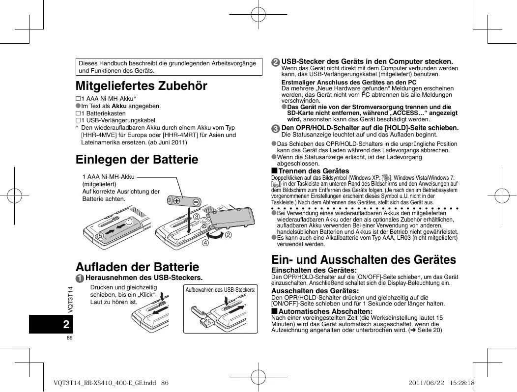 2011/06/22 15:00:31 Dieses Handbuch beschreibt die grundlegenden Arbeitsvorgänge und Funktionen des Geräts. Mitgeliefertes Zubehör 1 AAA Ni-MH-Akku *Im Text als Akku angegeben. 1 Batteriekasten 1 USB-Verlängerungskabel Den wiederaufladbaren Akku durch einem Akku vom Typ [HHR-4MVE] für Europa oder [HHR-4MRT] für Asien und Lateinamerika ersetzen. (ab Juni 2011) Einlegen der Batterie